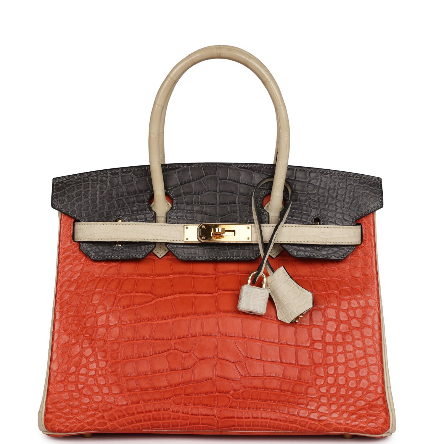 Pre-owned Hermes Special Order (HSS) Birkin 30 Beton, Graphite and Sanguine Matte Alligator Gold Hardware