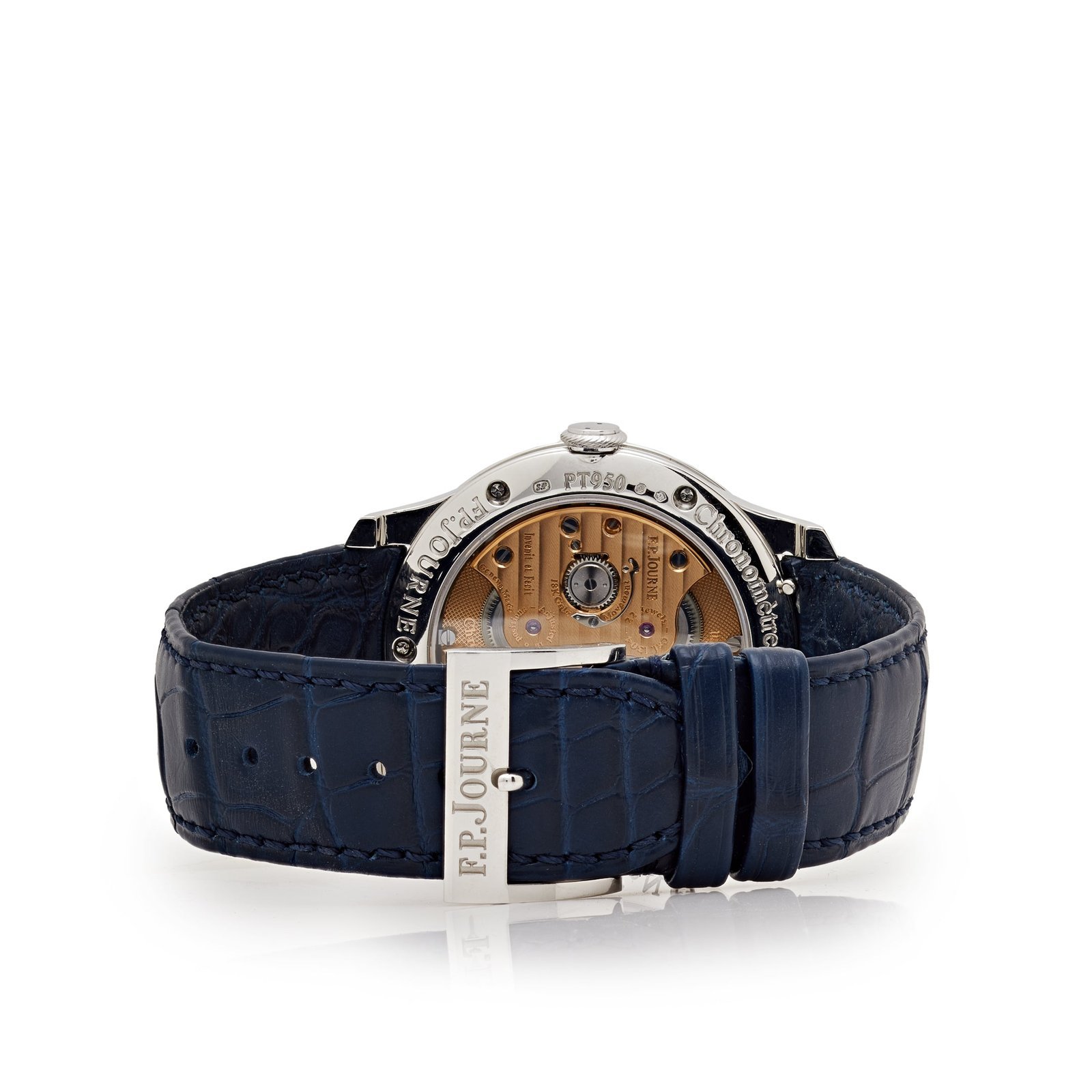 The F.P. Journe Chronomètre Souverain Classique Edition is a masterpiece of elegance and craftsmanship. Housed in a 40mm platinum case and paired with a black leather strap, it features a whitened guilloché silver dial and striking blued steel hands.