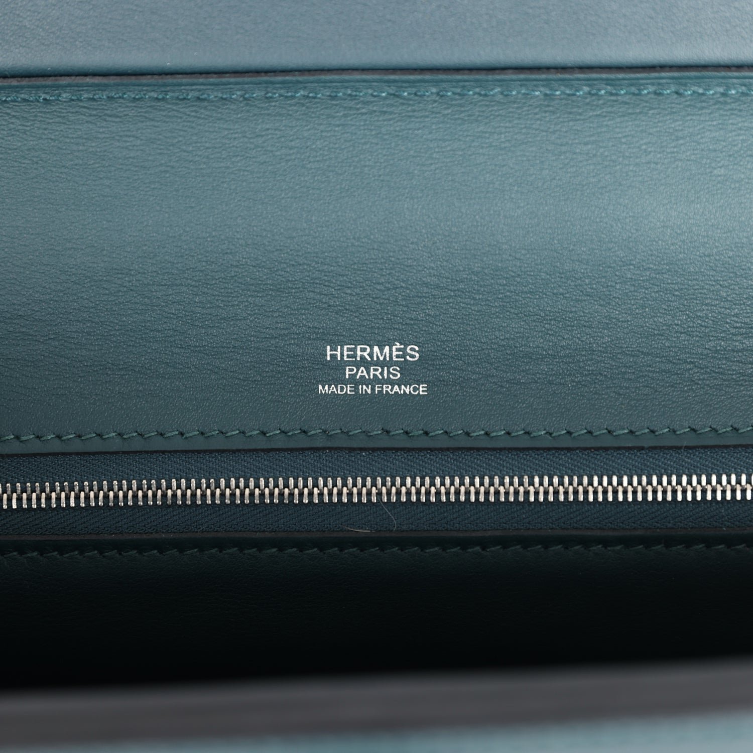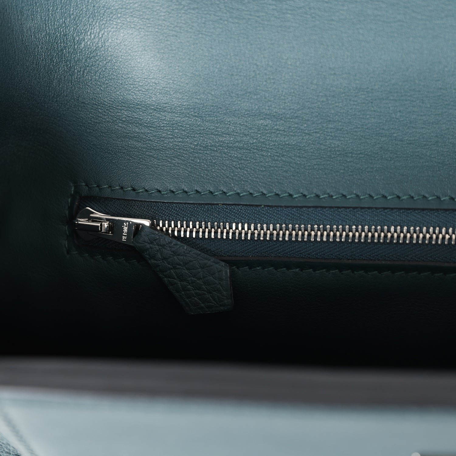 The interior is lined with Vert Cyress leather and has one zip pocket with an Hermes engraved pull on the back wall.