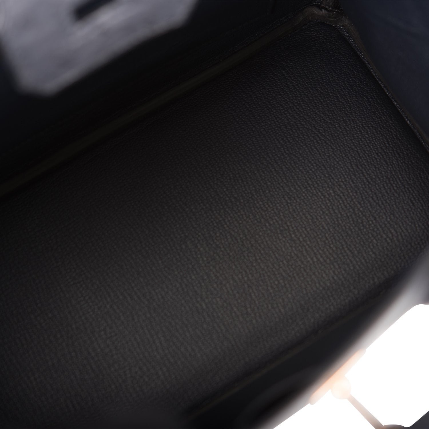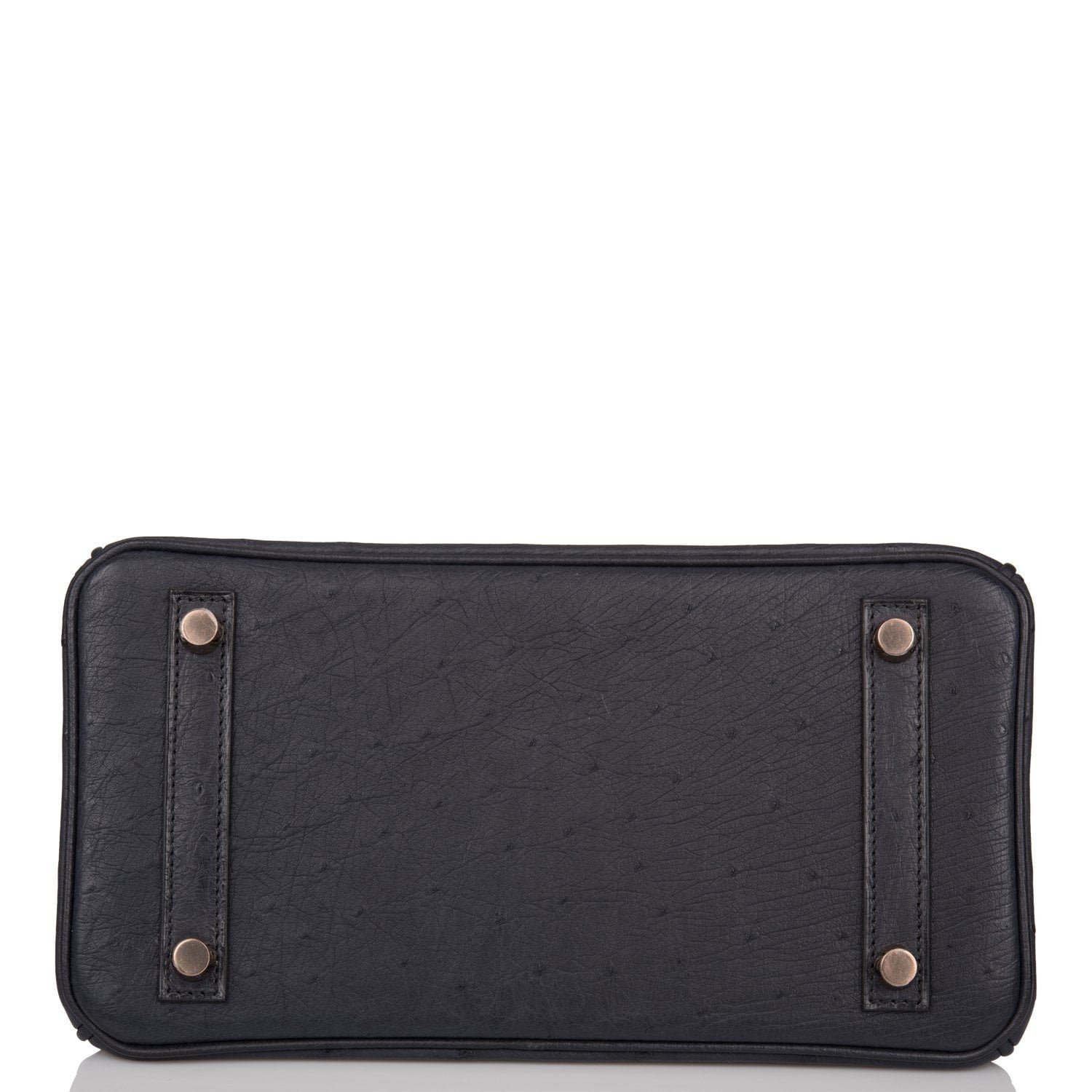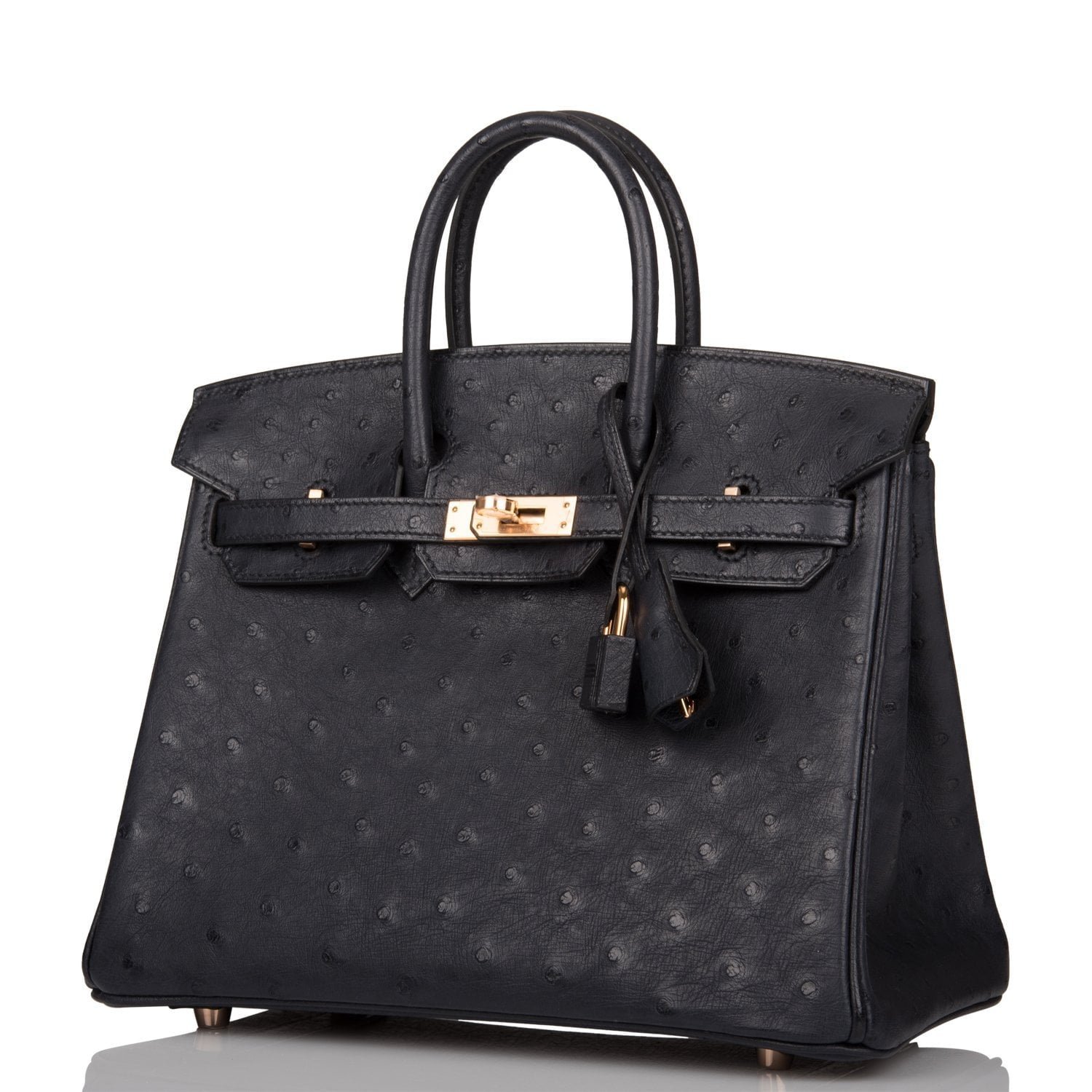 This Birkin is in Bleu Indigo ostrich with rose gold hardware and features tonal stitching, front flap, two straps with center toggle closure, clochette with lock and two keys, and double rolled handles.