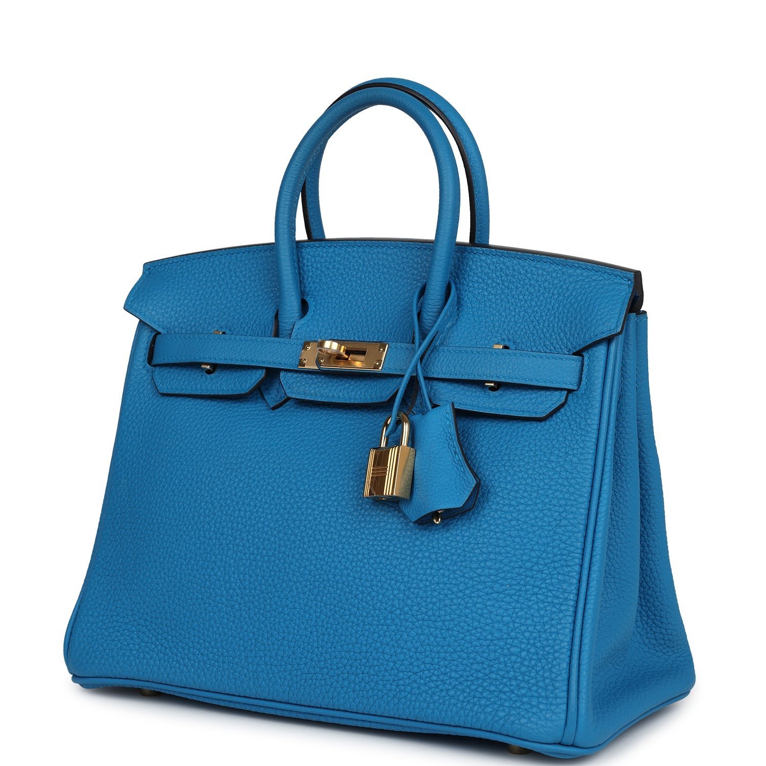 This Birkin is in Bleu Zanzibar Togo leather with gold hardware, tonal stitching, front flap with two straps, front toggle closure, clochette with lock and two keys, and double rolled handles.