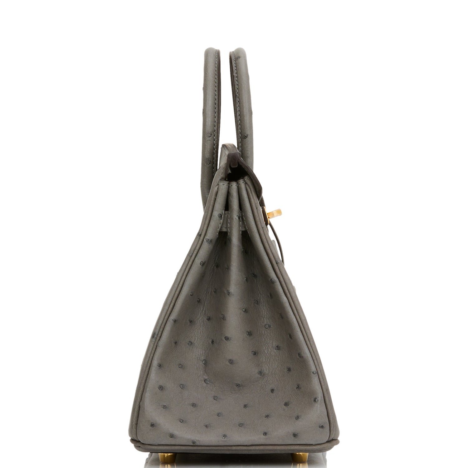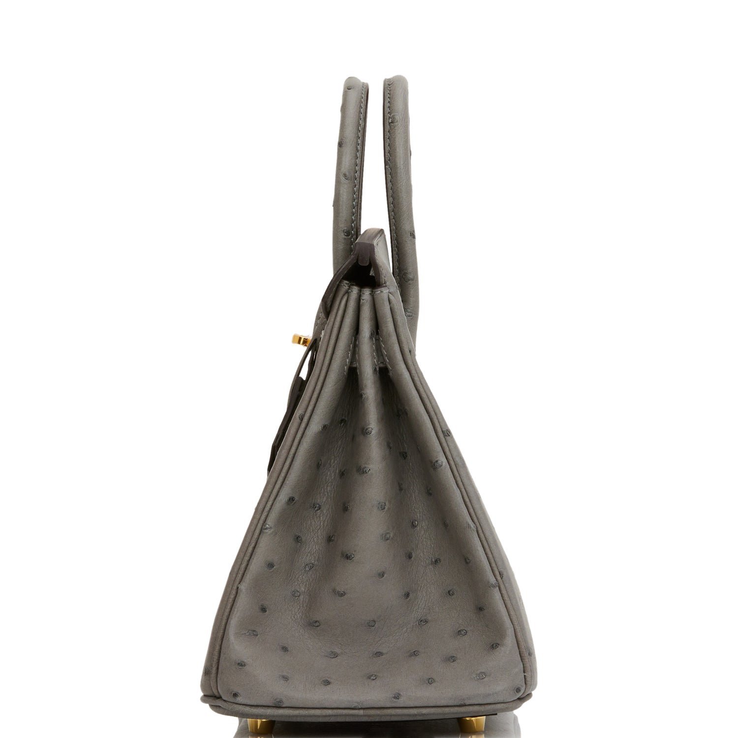 This Birkin is in Gris Meyer ostrich with gold hardware and features tonal stitching, front flap, two straps with center toggle closure, clochette with lock and two keys, and double rolled handles.