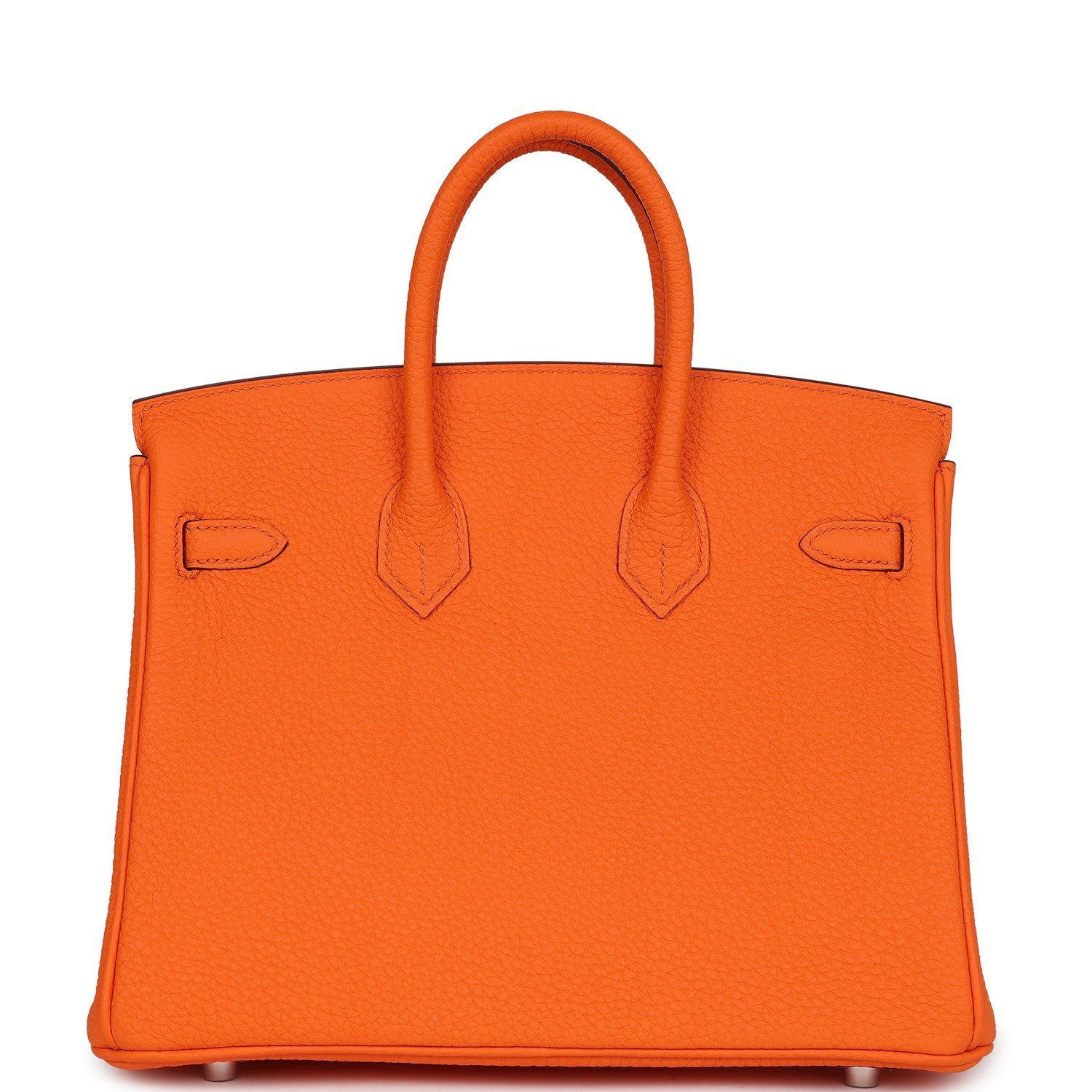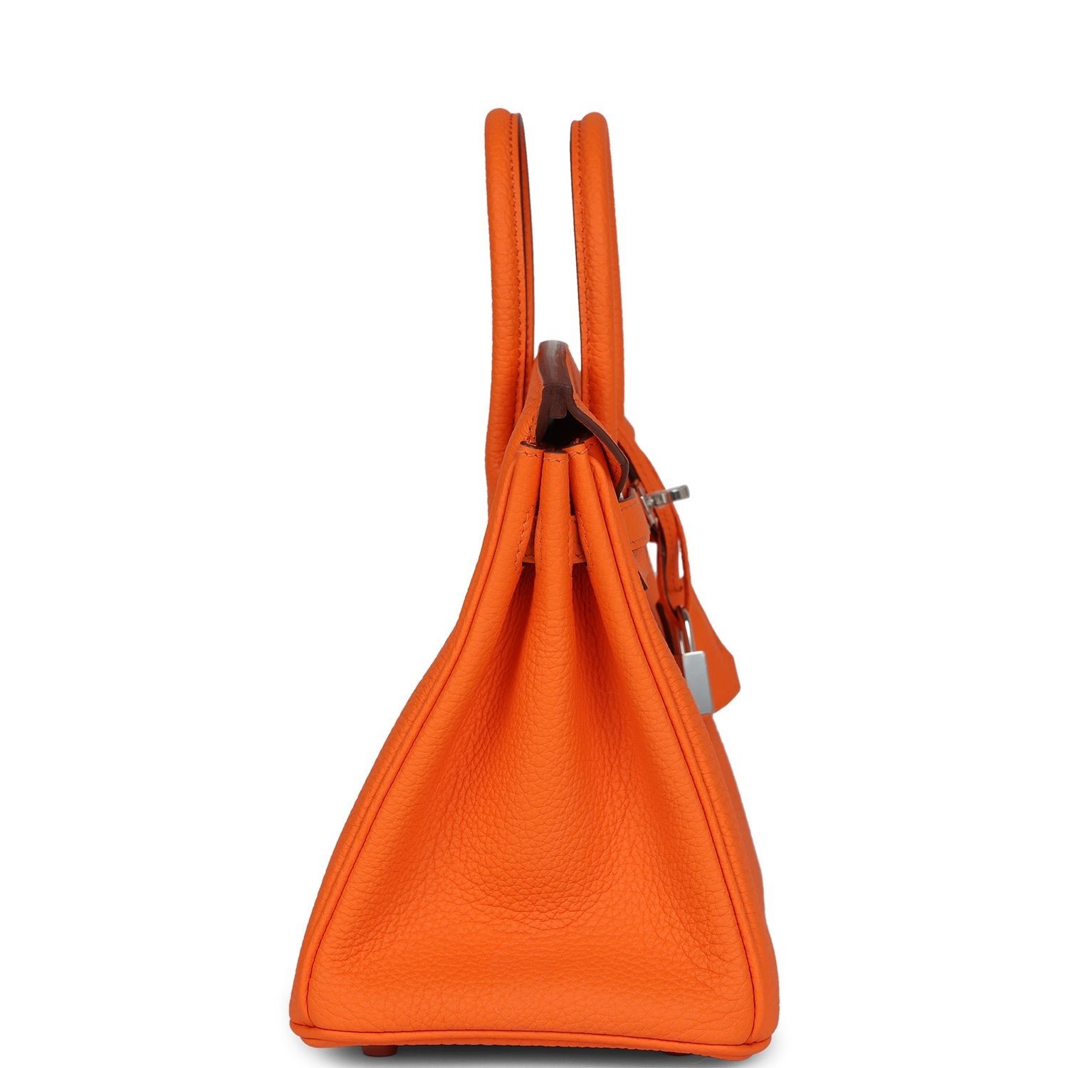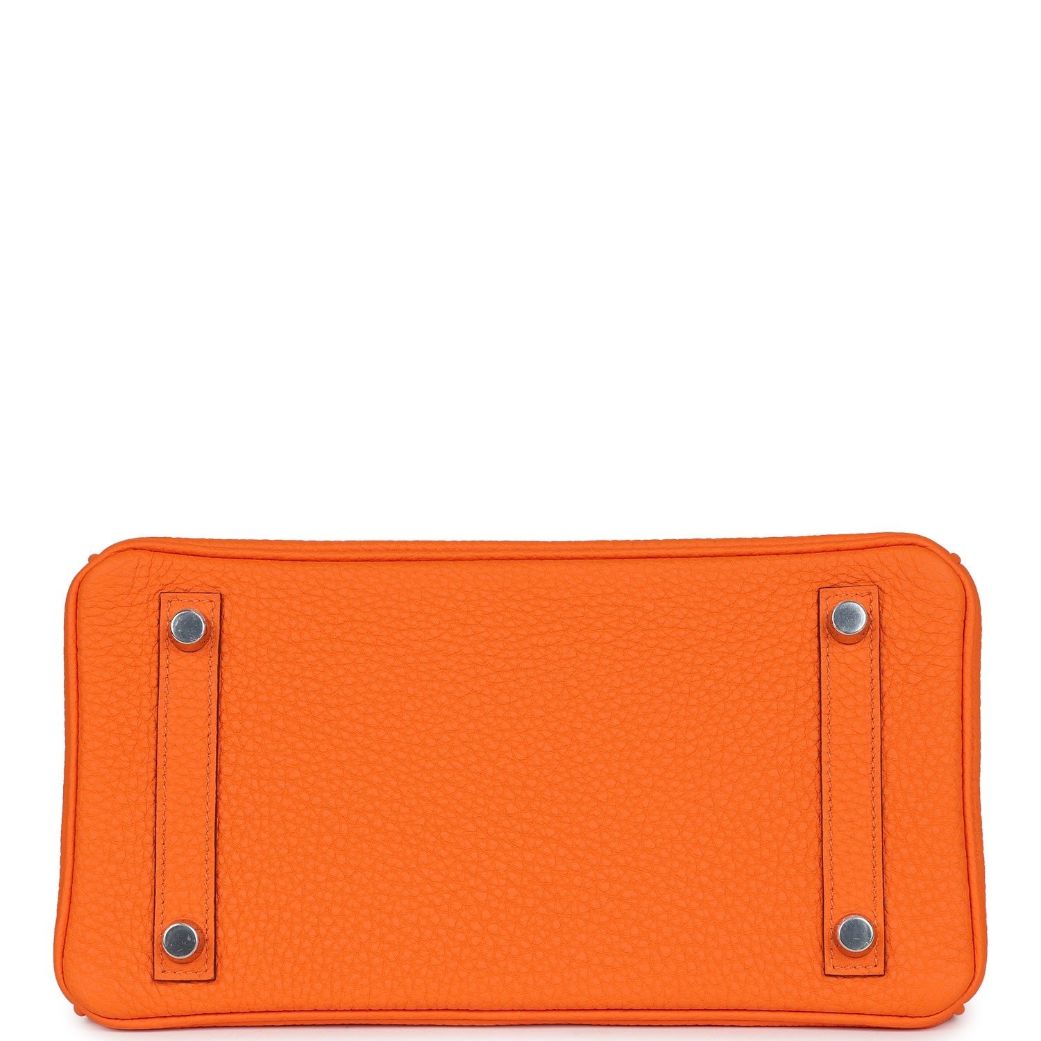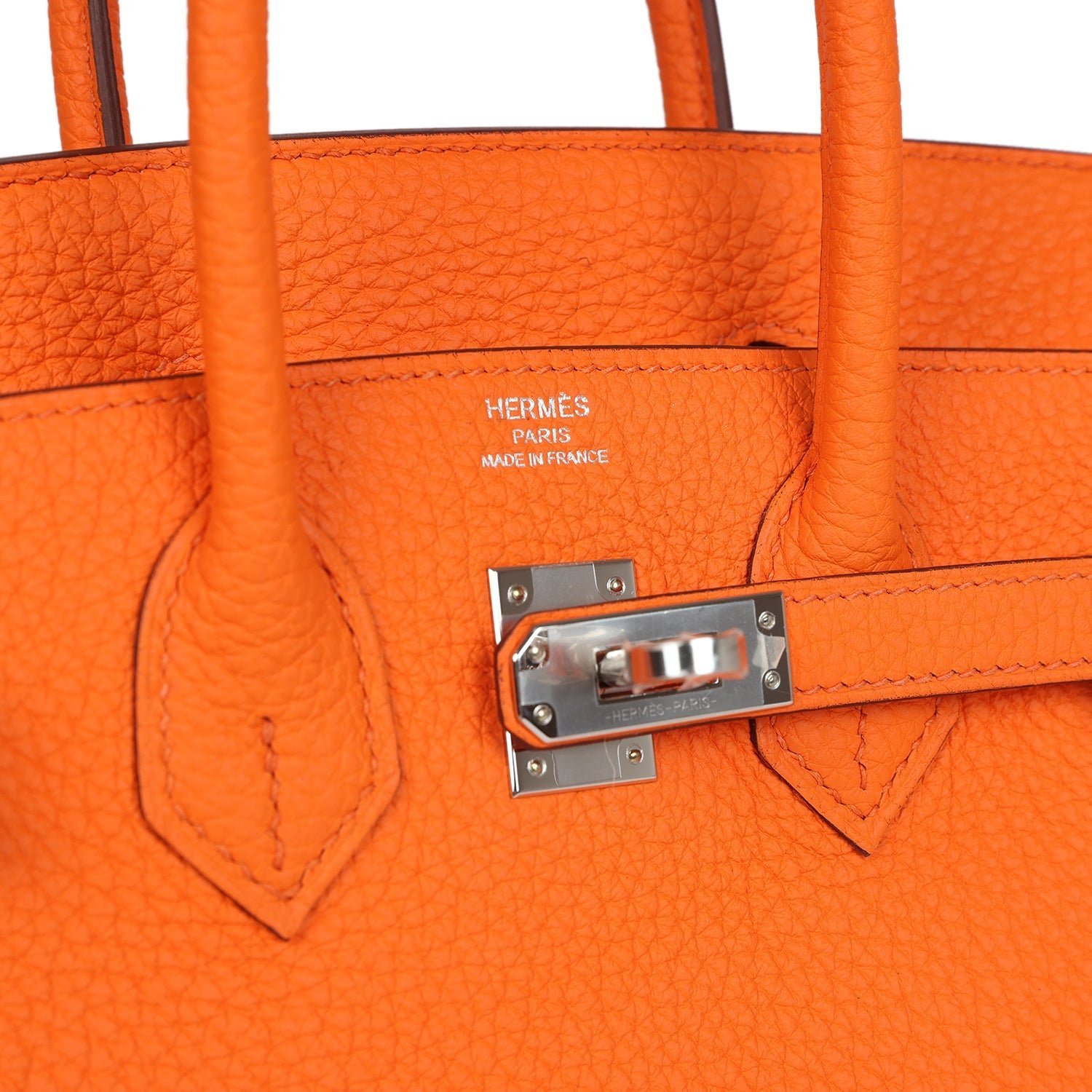 This Birkin is in Orange Minium togo leather with palladium hardware and has tonal stitching, front flap, two straps with center toggle closure, clochette with lock and two keys, and double rolled handles.