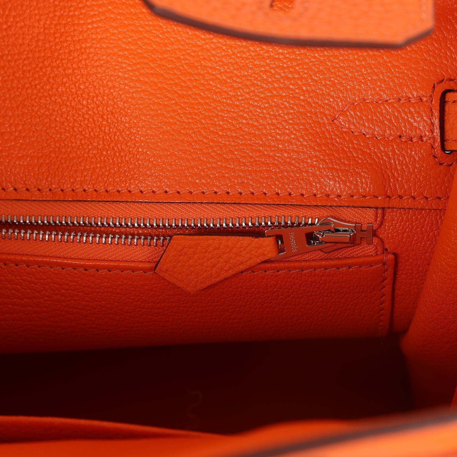 The interior is lined with Orange Minium chevre and has a zip pocket with an Hermes engraved zipper pull and an open pocket on the opposite side.