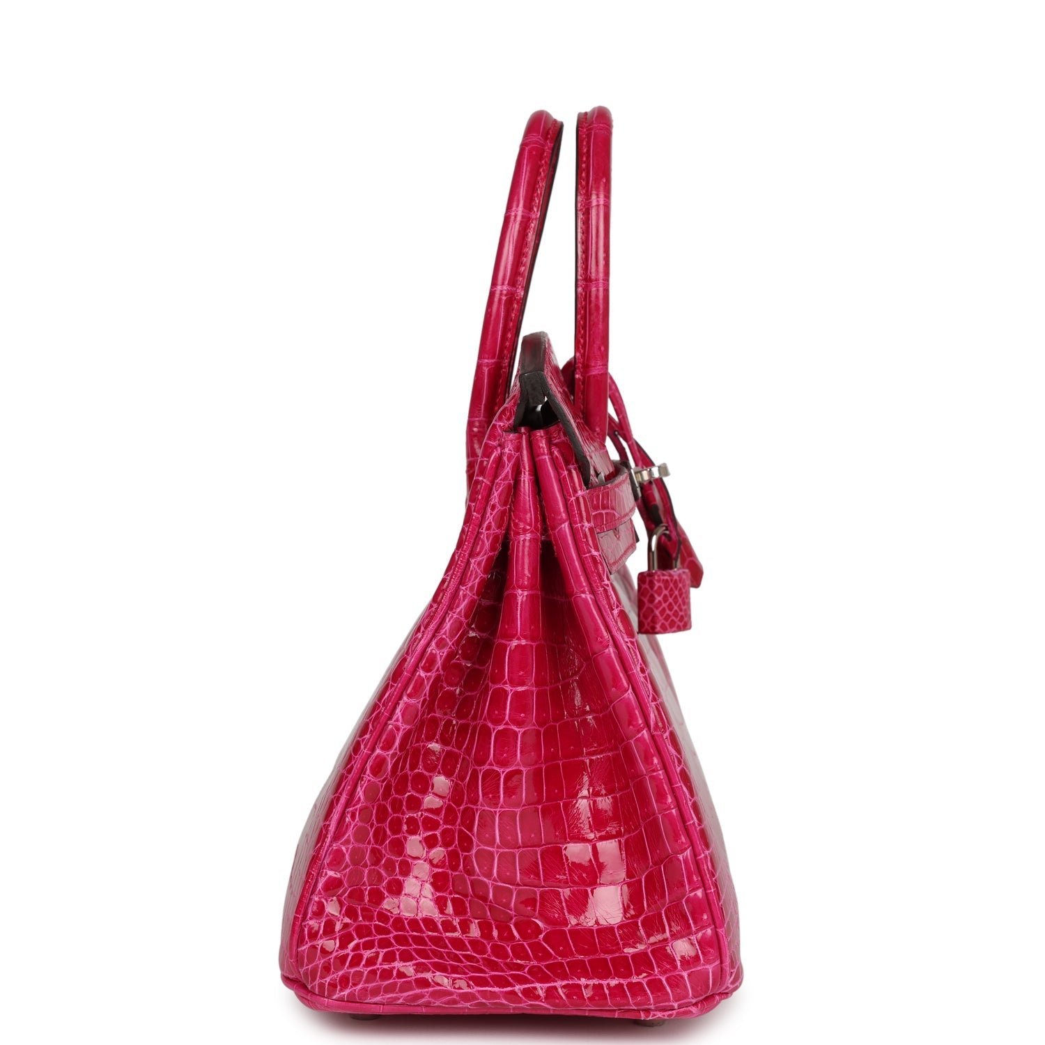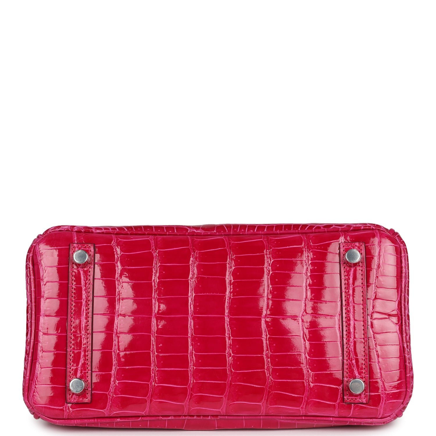 This Birkin is in Rose Mexico shiny Porosus crocodile leather with palladium hardware and has tonal stitching, front strap, two straps with center toggle closure, clochette with lock and two keys and double rolled handles.