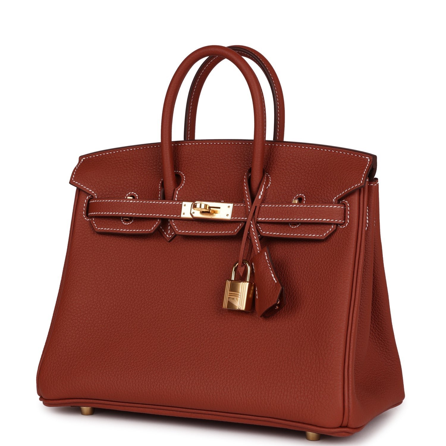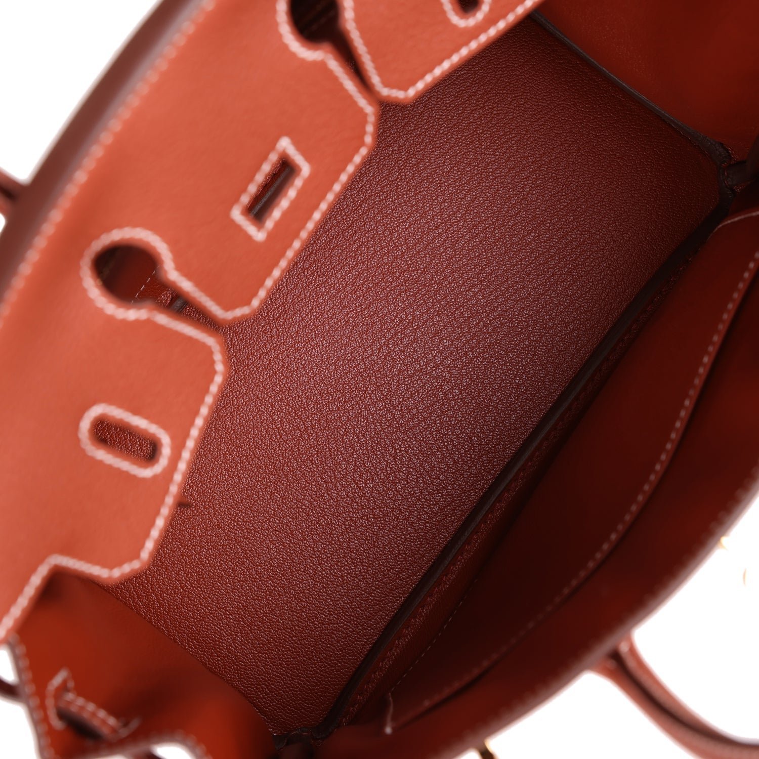 This Birkin is in Sienne togo leather with gold hardware and features contrast stitching, front flap, two straps with center toggle closure, a clochette with lock and two keys and double rolled handles.