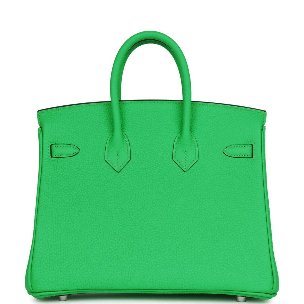 This Birkin 25 is in Vert Comics Togo with palladium hardware, tonal stitching, front flap with two straps, front toggle closure, clochette with lock and two keys, and double rolled handles.