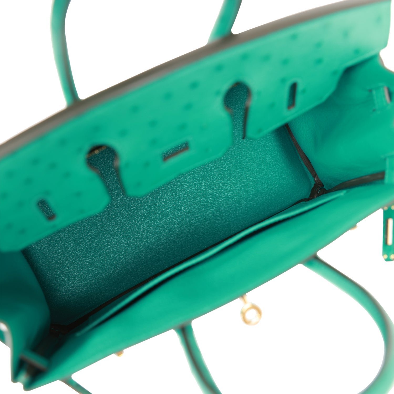 This Birkin is in Vert Verone ostrich with gold hardware and features tonal stitching, front flap, two straps with center toggle closure, clochette with lock and two keys, and double rolled handles.