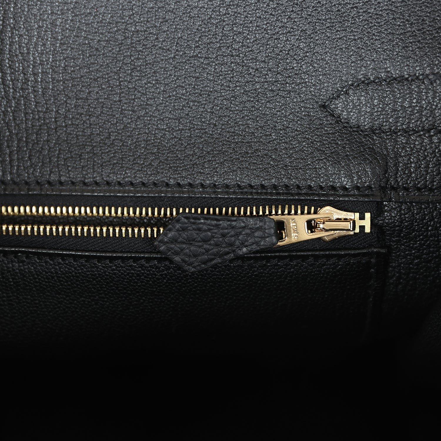 The interior is lined with black chevre and has one zip pocket with an Hermes engraved zipper pull and an open pocket on the opposite side.