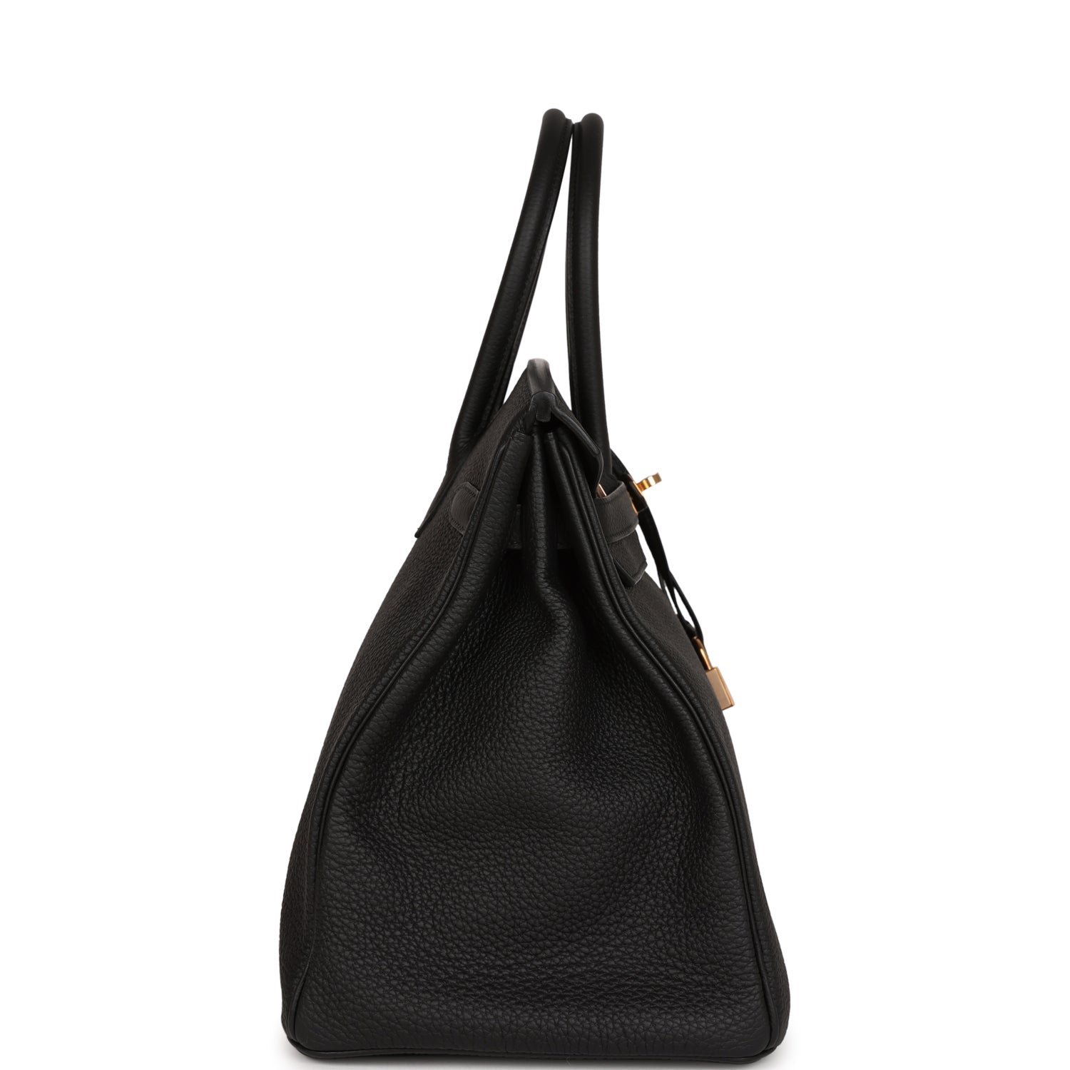This Birkin is in Black togo leather with rose gold hardware and has tonal stitching, front flap, two straps with center toggle closure, clochette with lock and two keys, and double rolled handles.