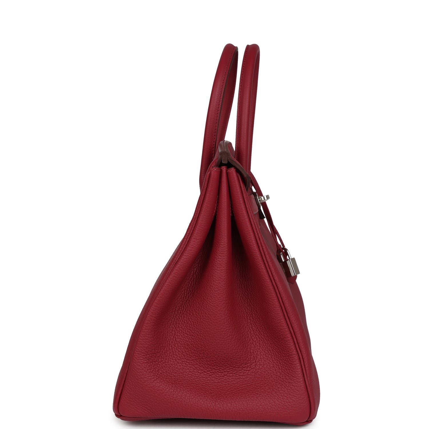 This Birkin is in Rubis togo leather with palladium hardware has tonal stitching, front flap, two straps with center toggle closure, clochette with lock and two keys, and double rolled handles.