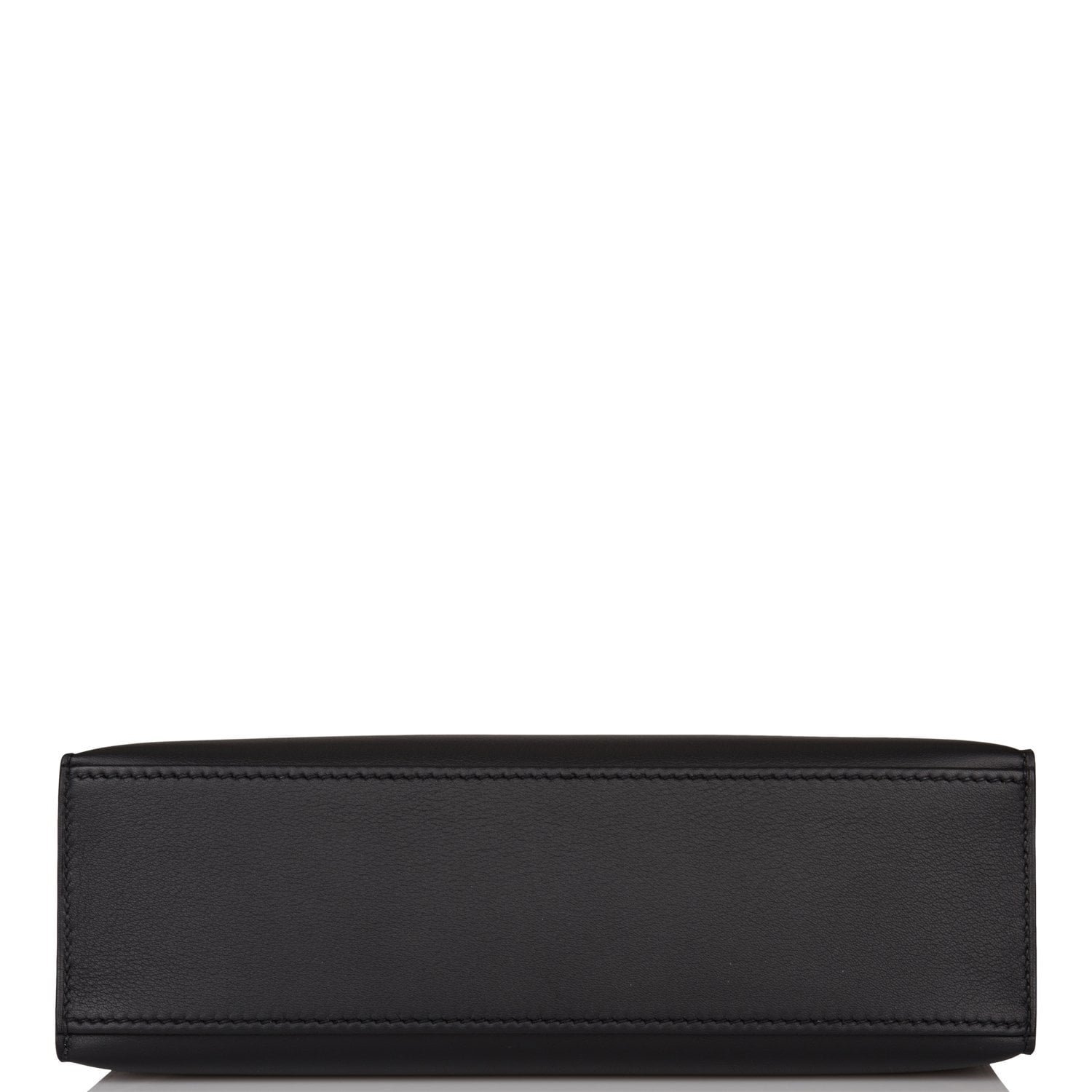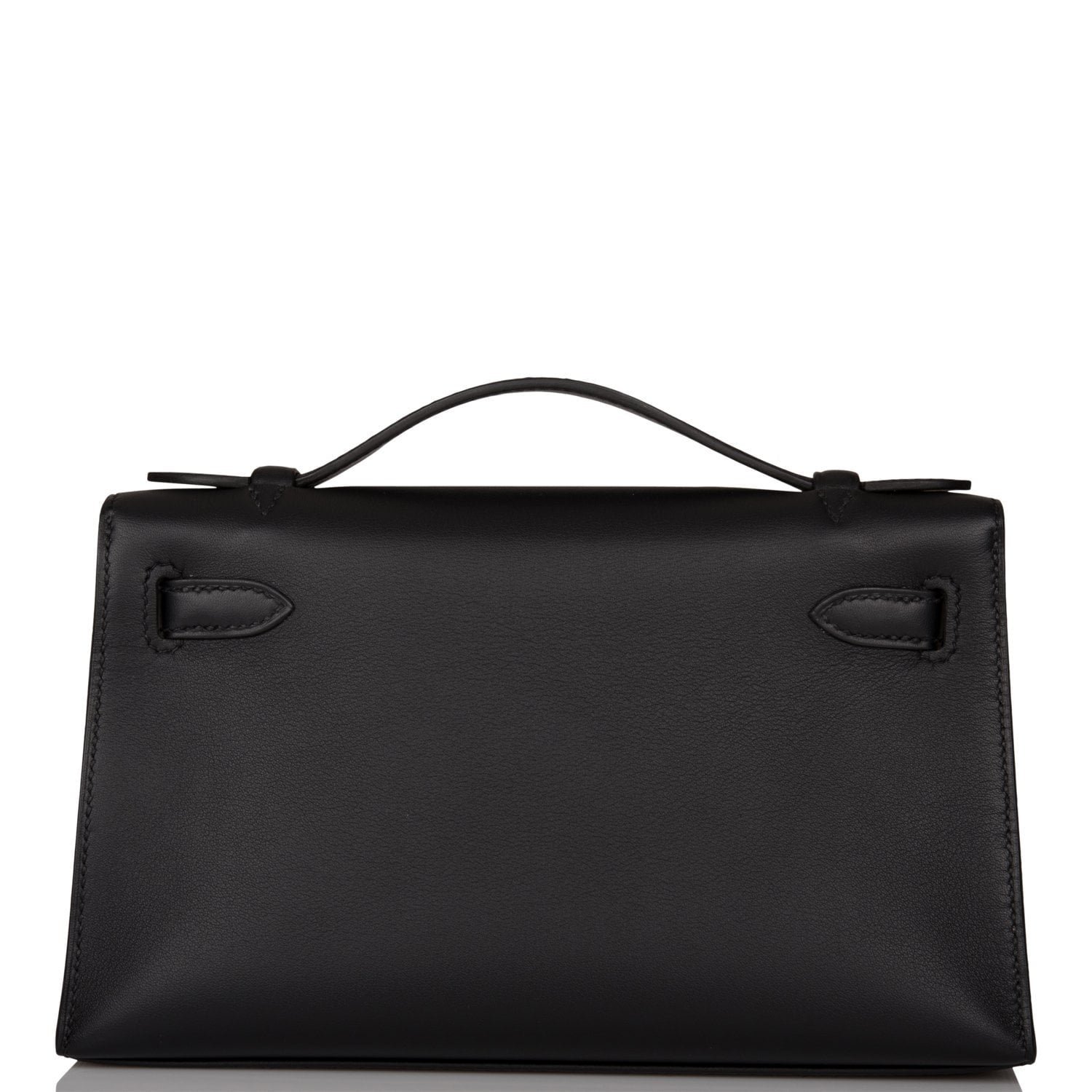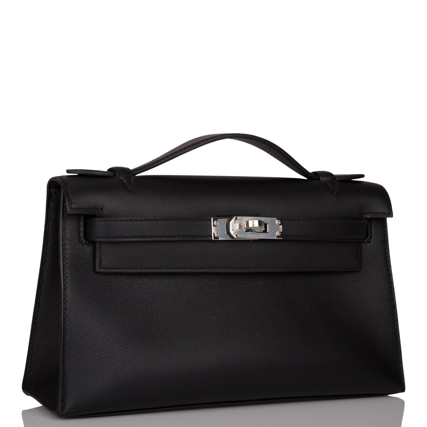 This Mini Kelly Pochette is in Black swift leather with palladium hardware and has tonal stitching, front flap, two straps with center toggle closure and a top flat handle.