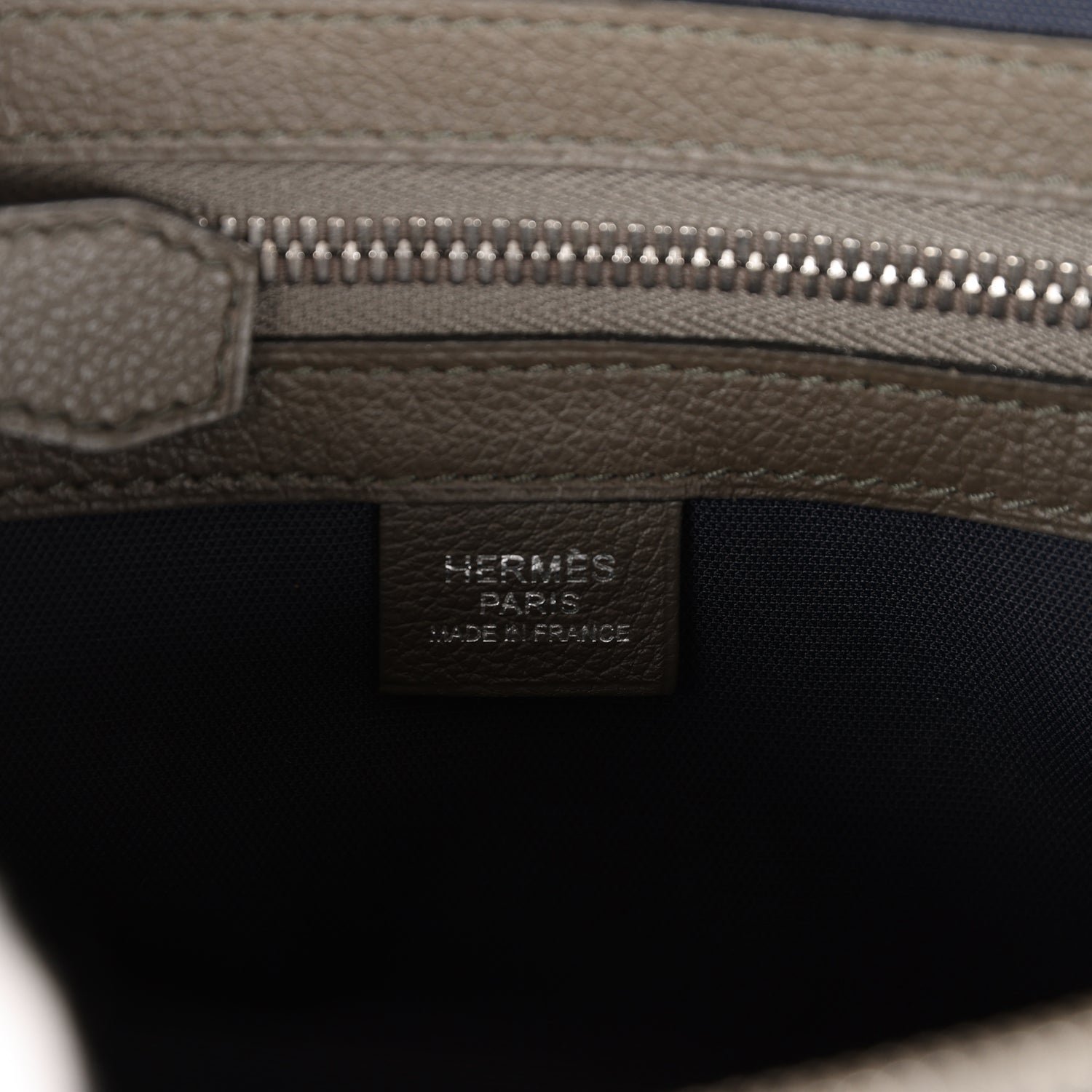 The interior is lined Navy blue canvas and has three compartments with zippered pockets on the interior and exterior rear wall