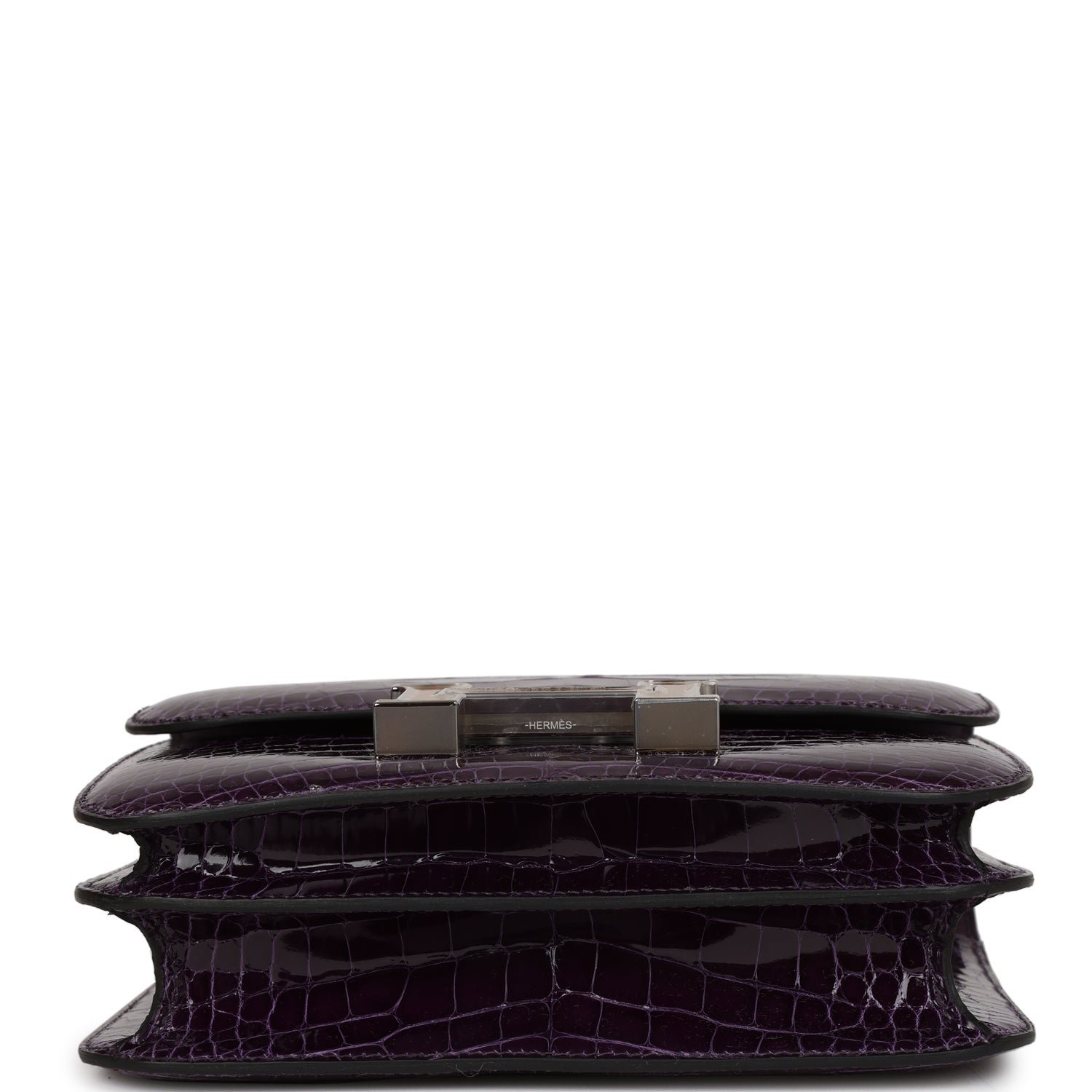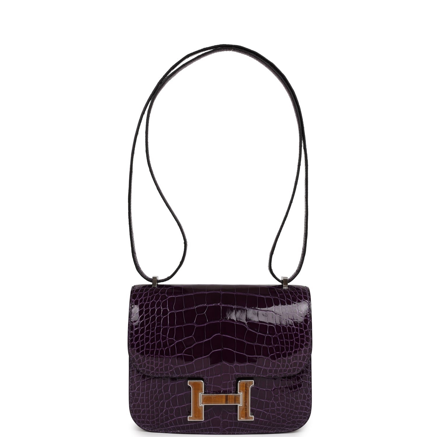 This Constance 18 is in Amethyst Shiny Alligator with Palladium Hardware inlaid with Tigers Eye Quartz, tonal stitching, quartz and metal “H” snap closure, and adjustable strap