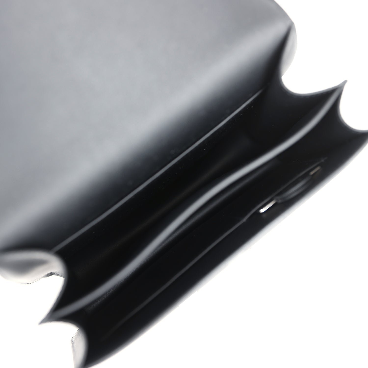 The interior is lined with Black lambskin and has two open pocket on the front wall, a removable mirror, a center divide, and a slit pocket on the back wall.
