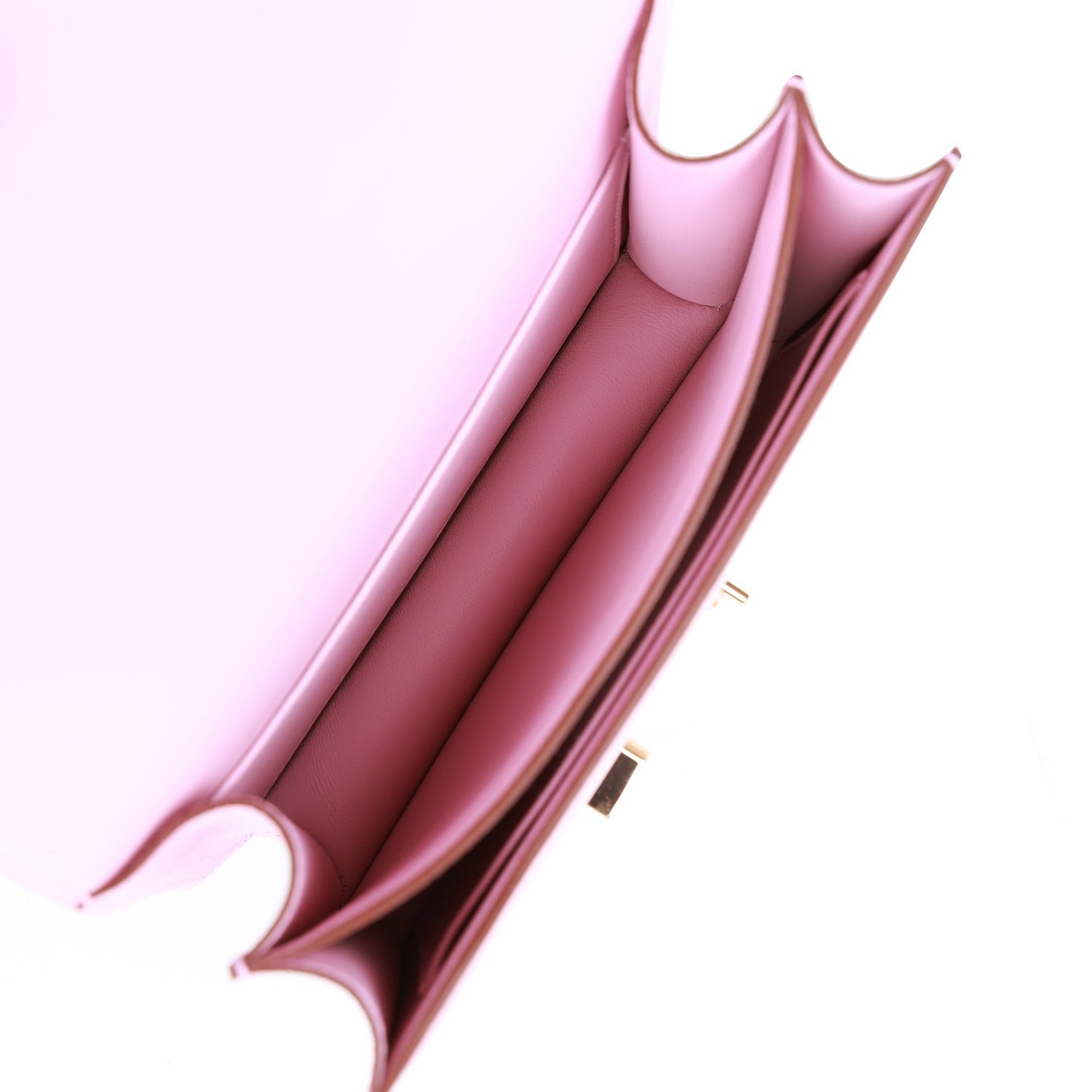 The interior is lined with Mauve Sylvestre lambskin and has an open pocket on the front wall, a center divide, and a slit pocket on the back wall.