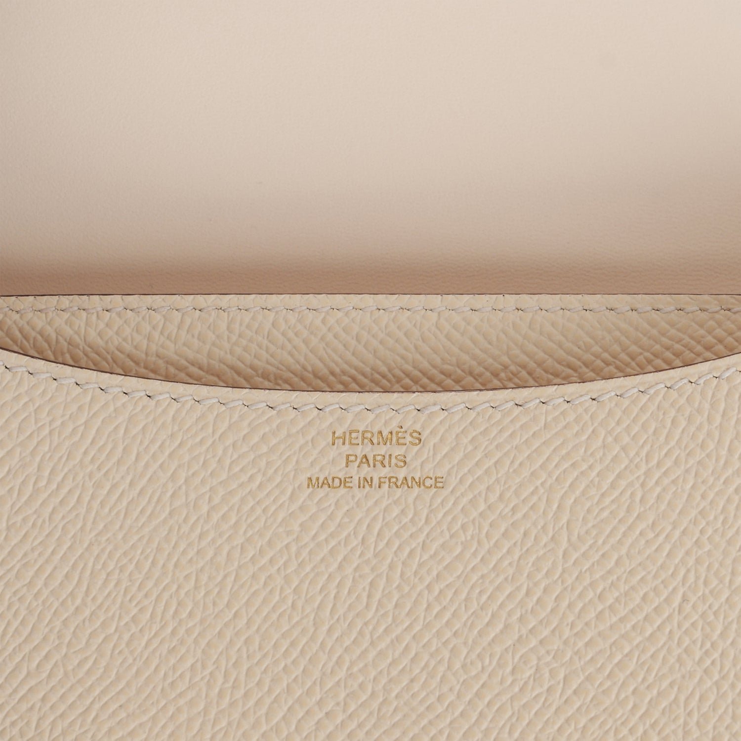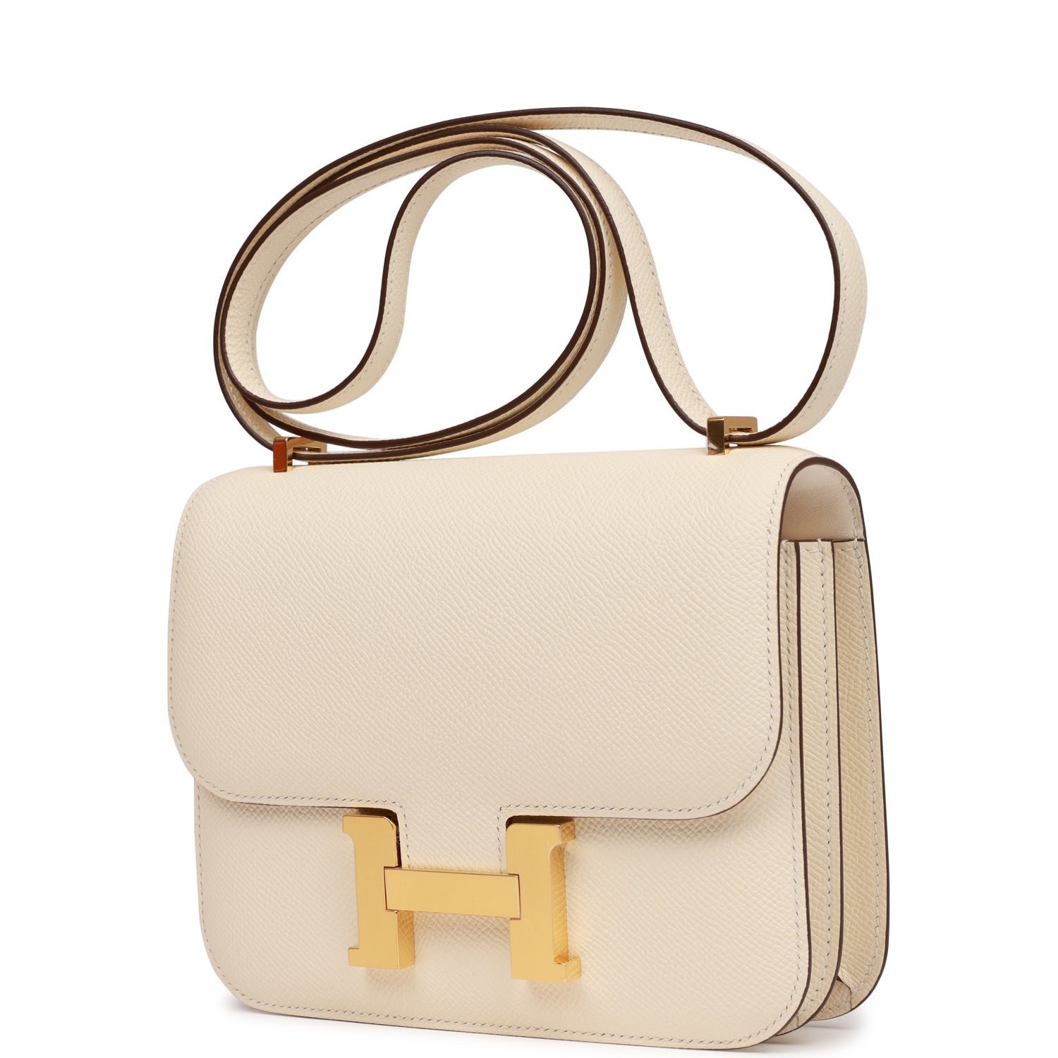 This Constance is in Nata epsom leather with gold hardware and has tonal stitching, a metal “H” snap lock closure and adjustable shoulder strap.