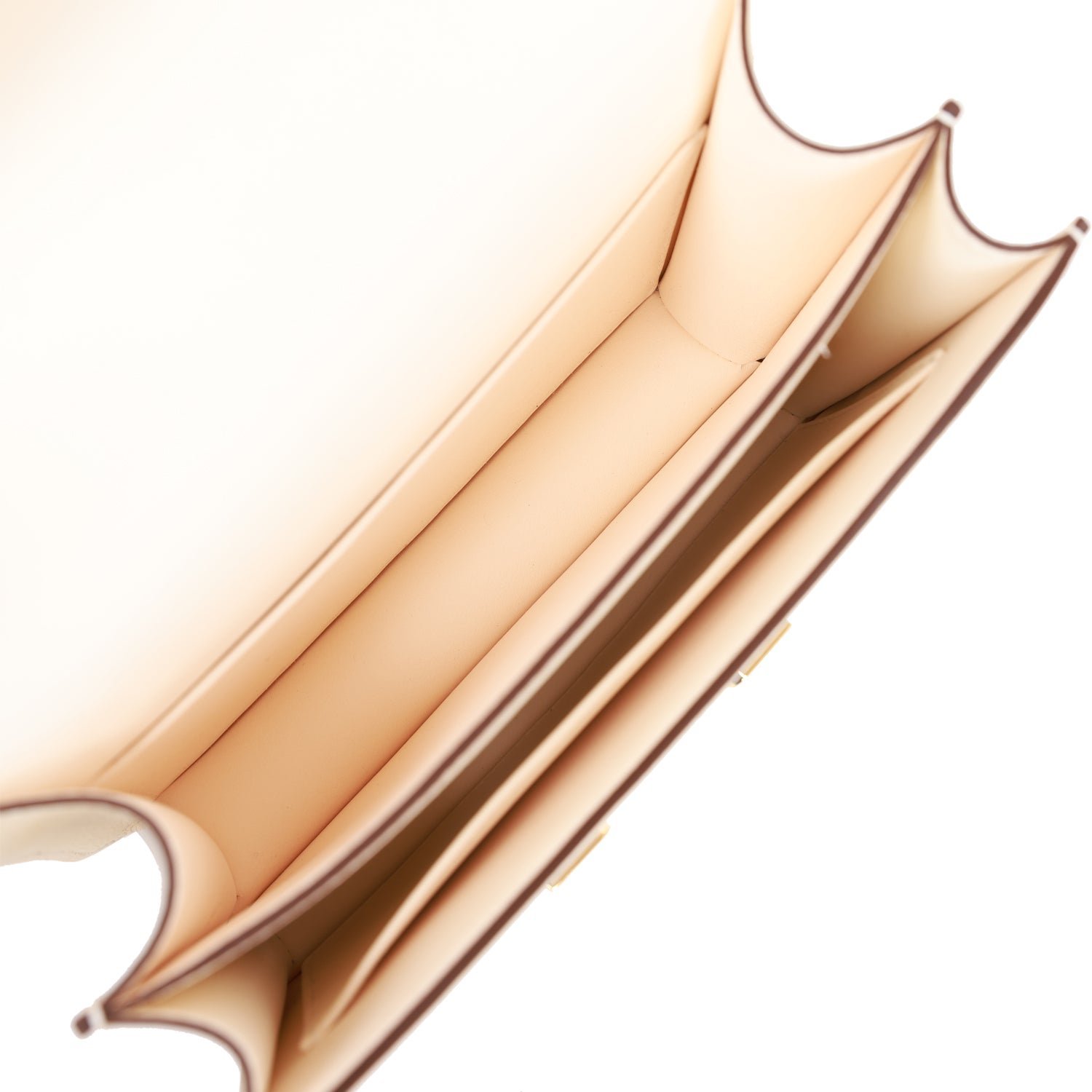 The interior is lined with Nata lambskin and has an open pocket on the front wall, a center divide, and a slit pocket on the back wall.