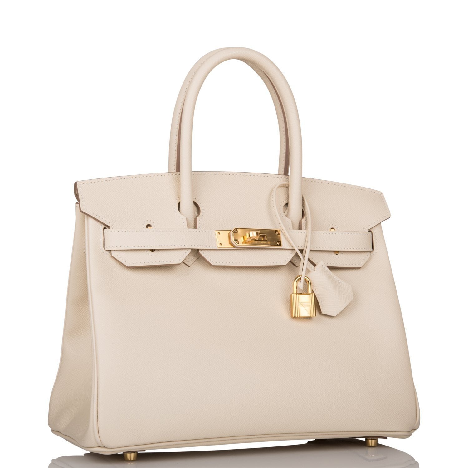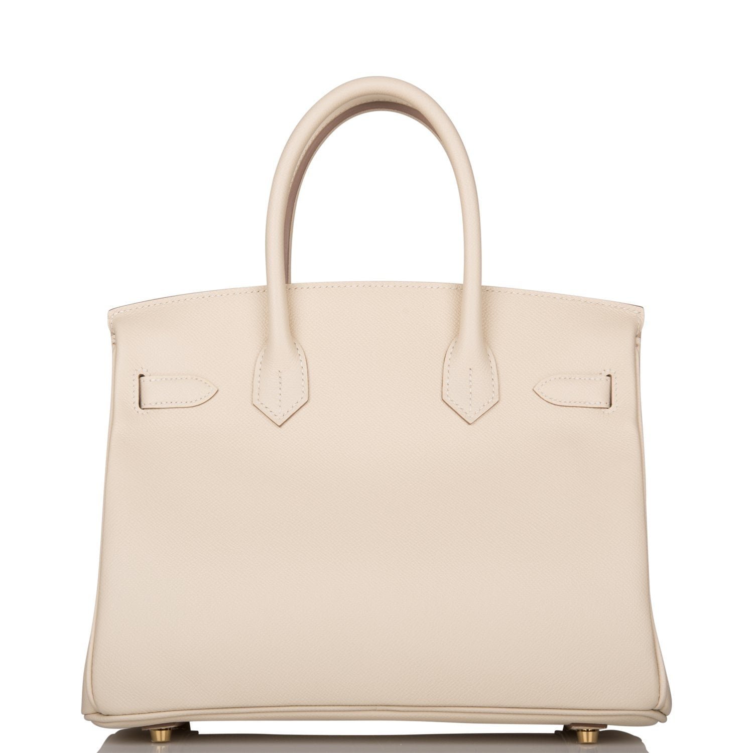 This Birkin is in Craie epsom leather with gold hardware and has tonal stitching, front flap, two straps with center toggle closure, clochette with lock and two keys and double rolled handles.