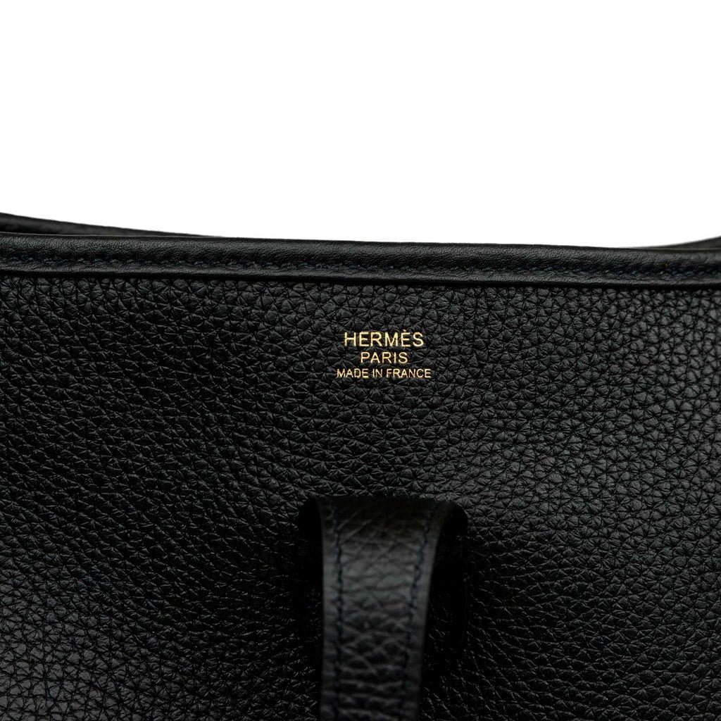 This Evelyne is in Black clemence leather with gold hardware, has tonal stitching, pull tab top closure and black removable canvas and leather shoulder/crossbody strap.