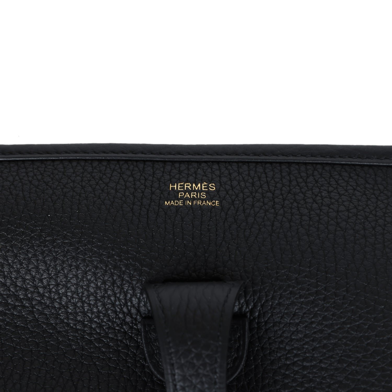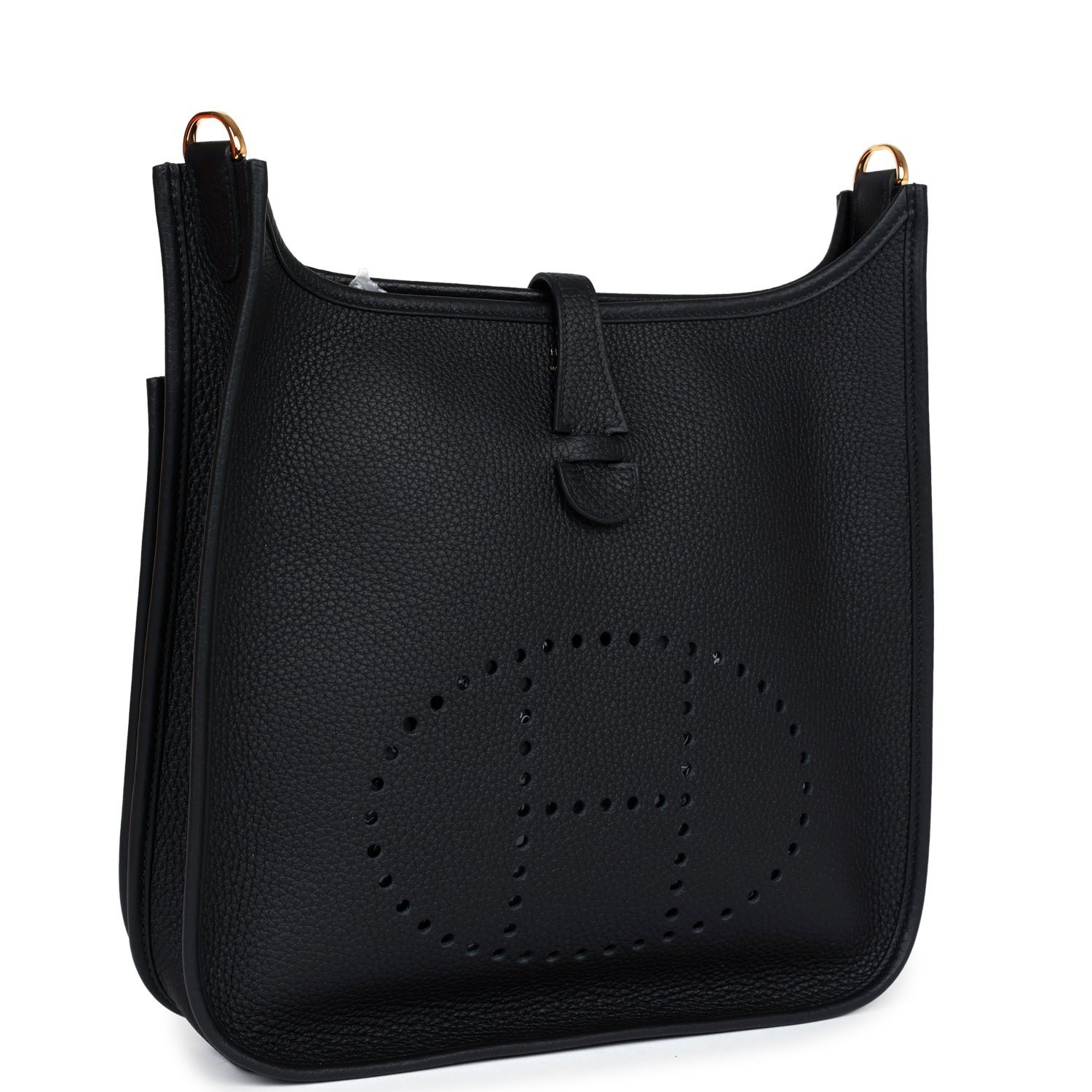 This Evelyne is in Black clemence leather with gold hardware and has tonal stitching, pull tab top closure and Black removable canvas and leather shoulder/crossbody strap.