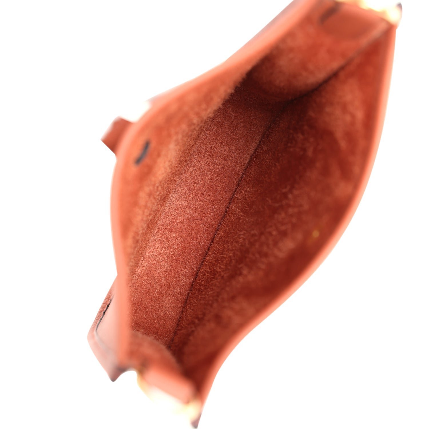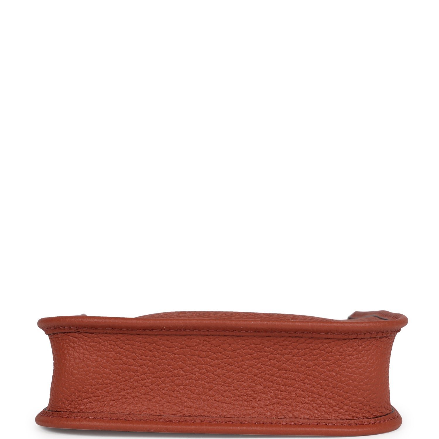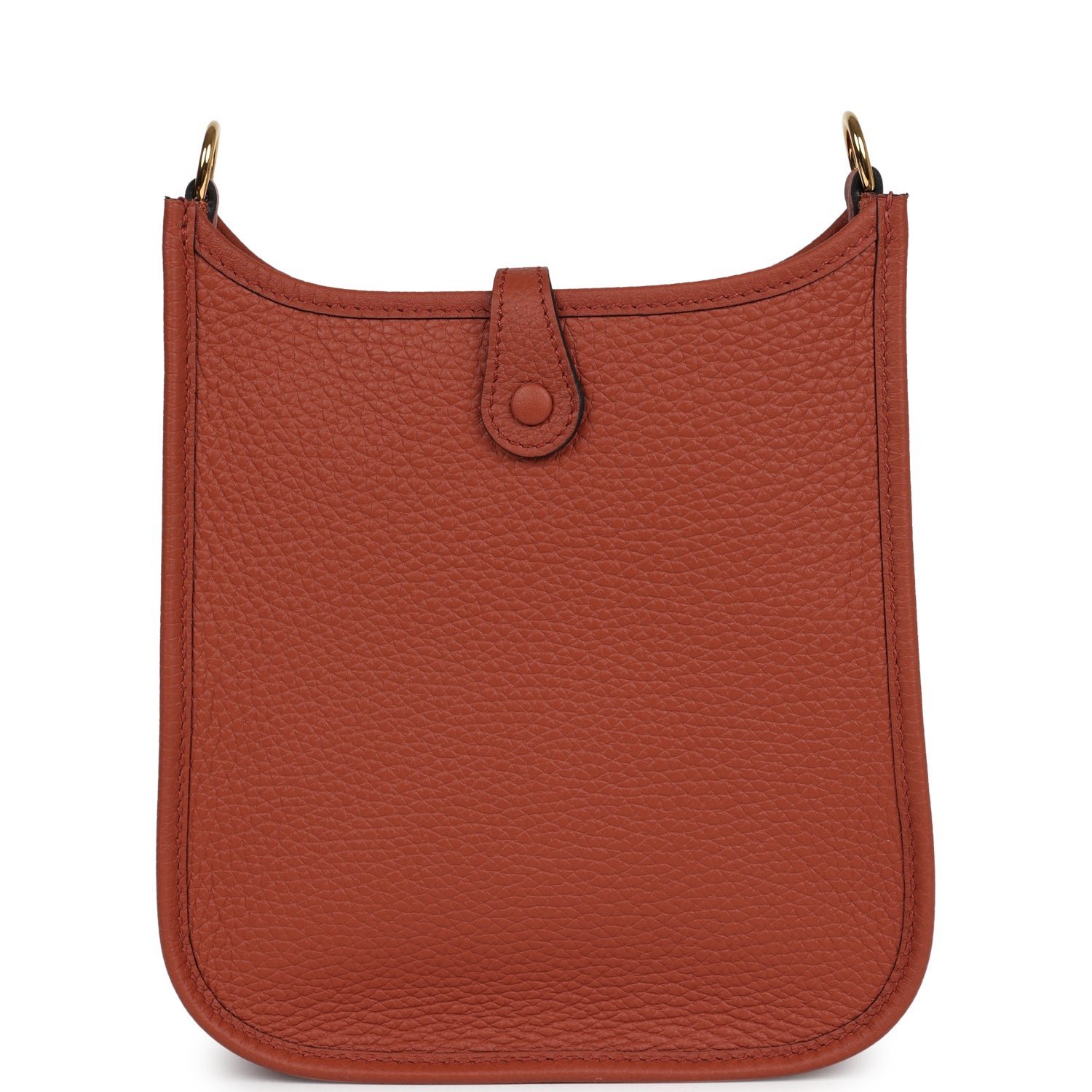 This Hermes Evelyne TPM is in Cuivre Taurillon clemence leather with gold hardware, tonal stitching, gold hardware, large perforated H in circle (front), pull tab snap closure, and a detachable Cuivre shoulder/crossbody strap.