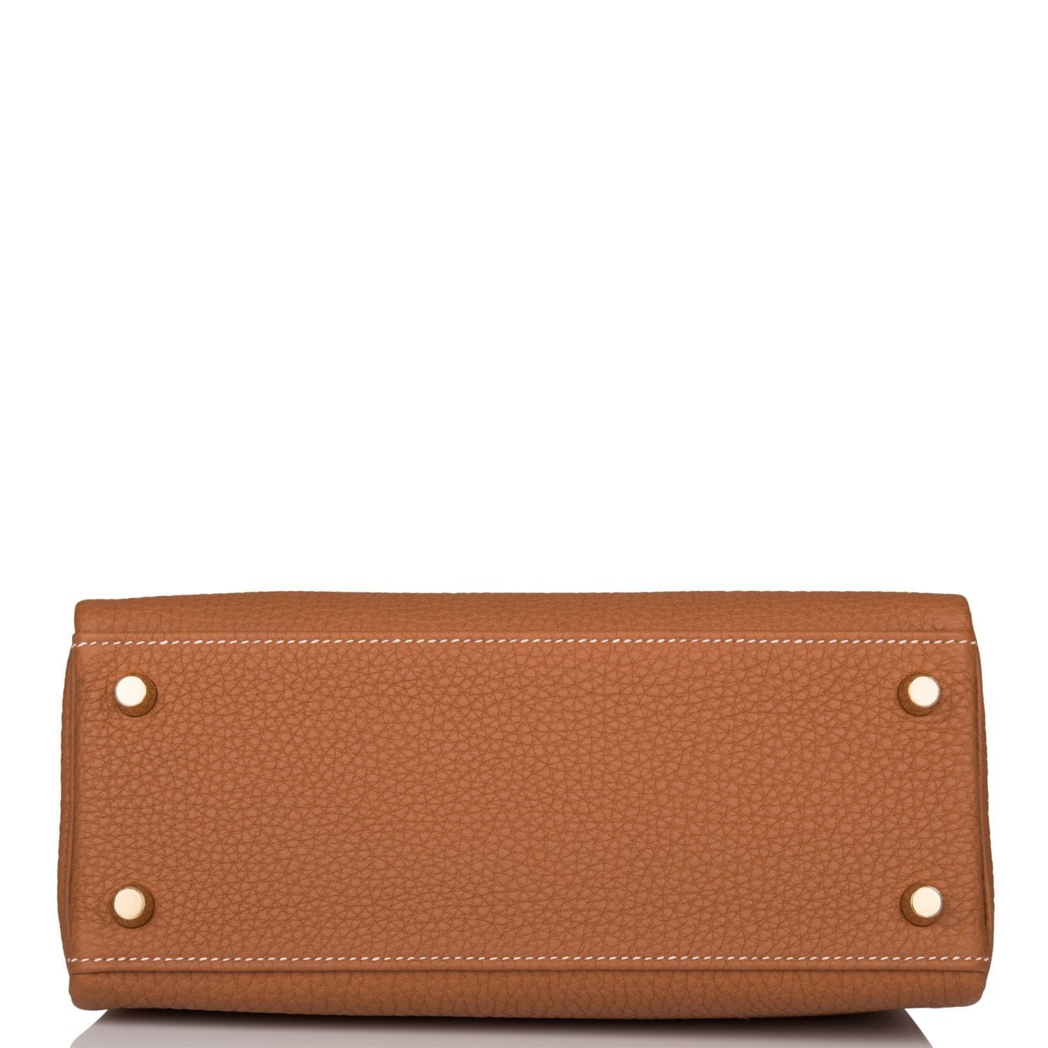 This Retourne Kelly is of gold togo leather with gold hardware and has contrast stitching, front flap, two straps with center toggle closure, clochette with lock and two keys, single rolled handle and an optional shoulder strap.