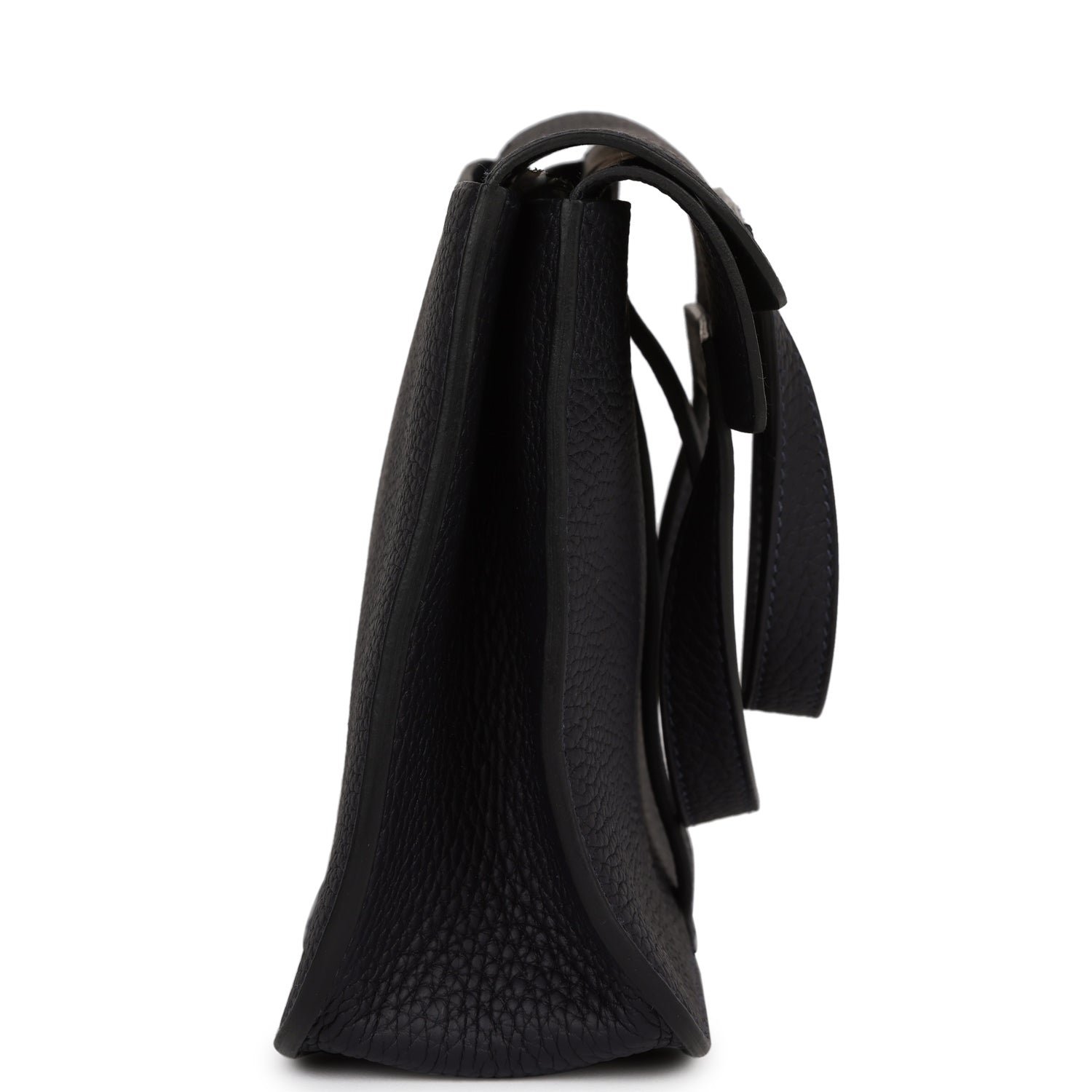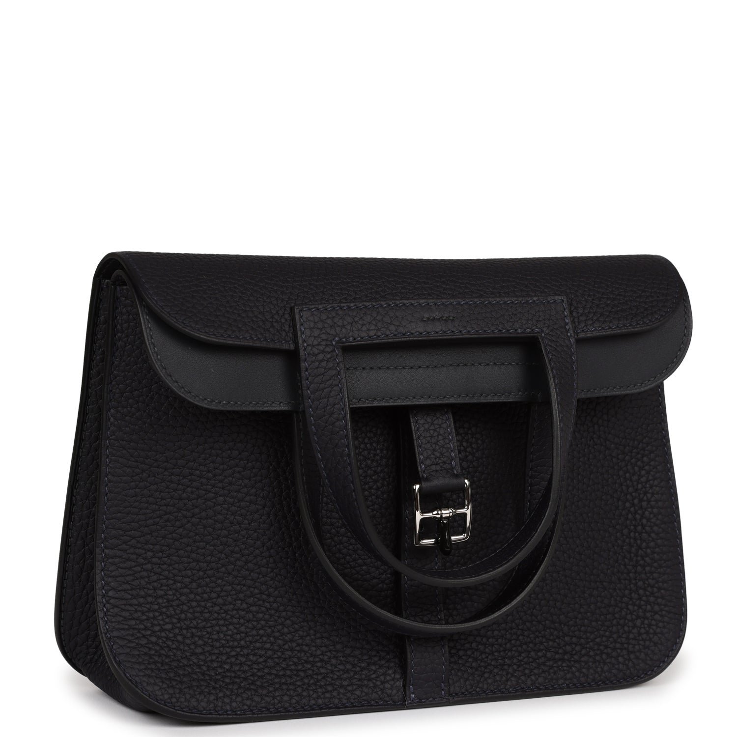 This Halzan is in Caban clemence leather with palladium hardware and has tonal stitching, front loop closure, foldable top handles, and a long crossbody strap for multistyle wear.