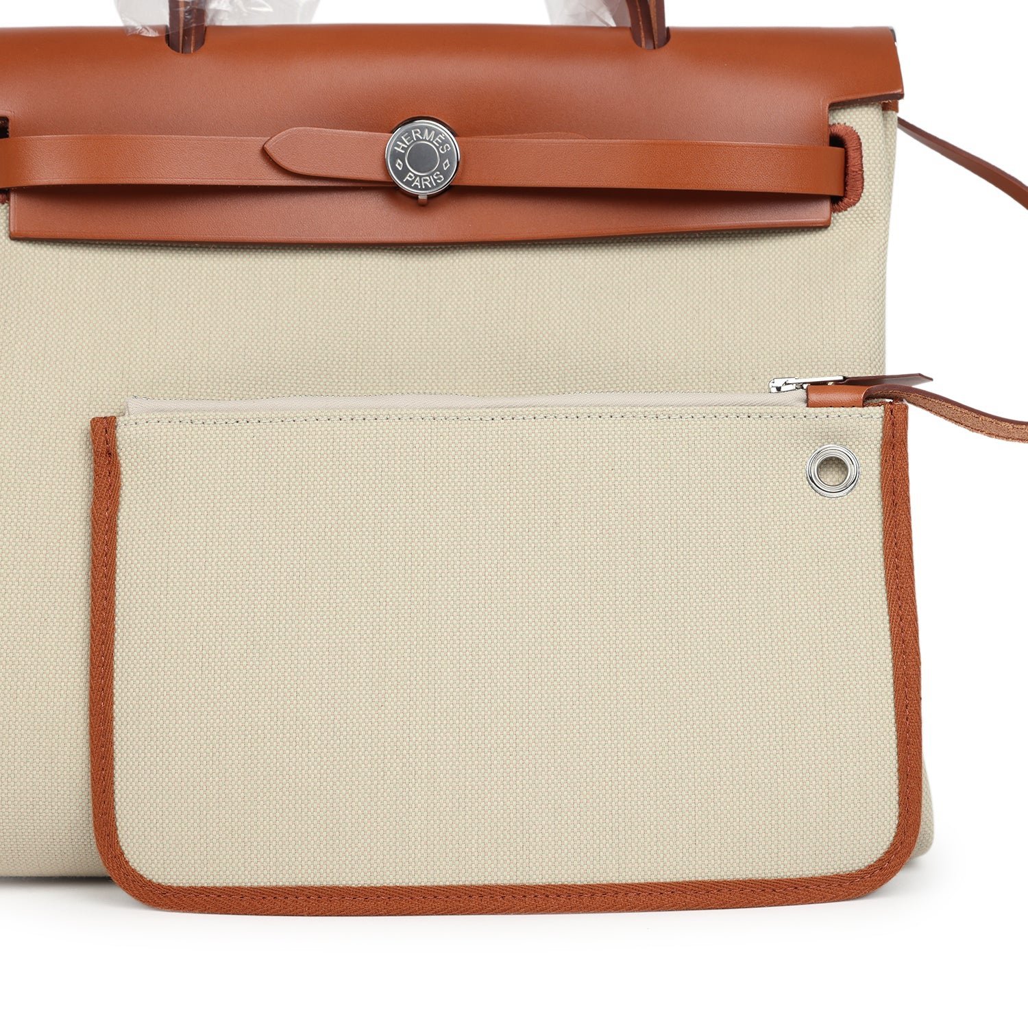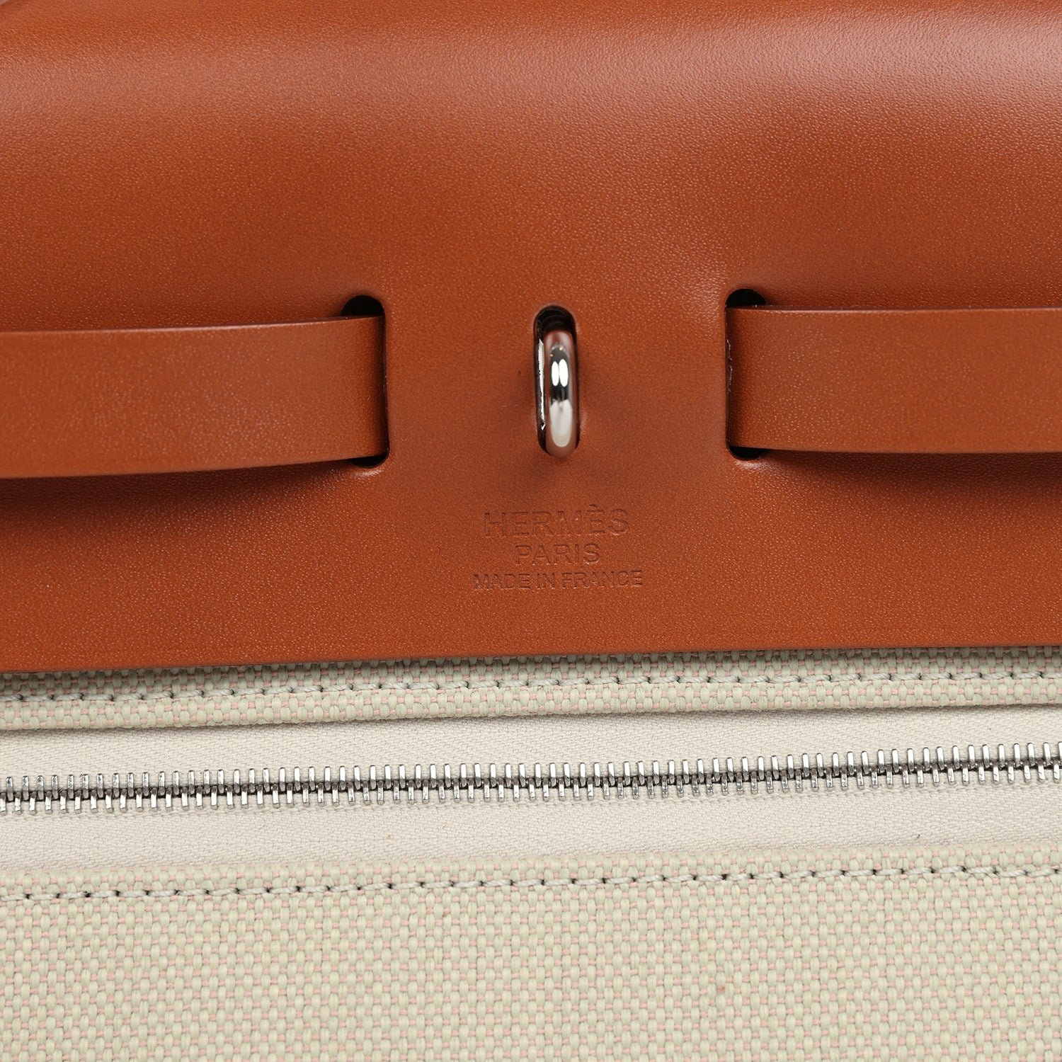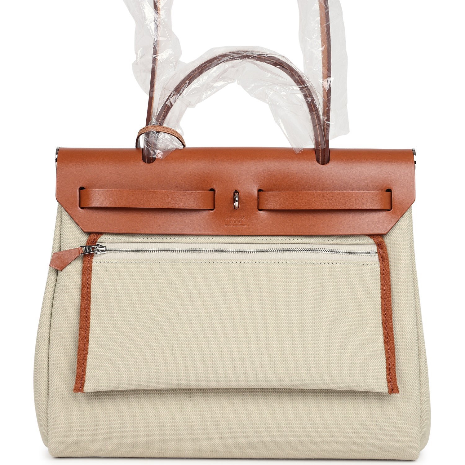 This Herbag Zip 31 is in Beton Toile H canvas and Fauve Vache Hunter leather with palladium hardware and has tonal stitching, clou de selle closure, top handle and shoulder strap in hunter leather, clochette, interior zip pouch and zip pocket on exterior.