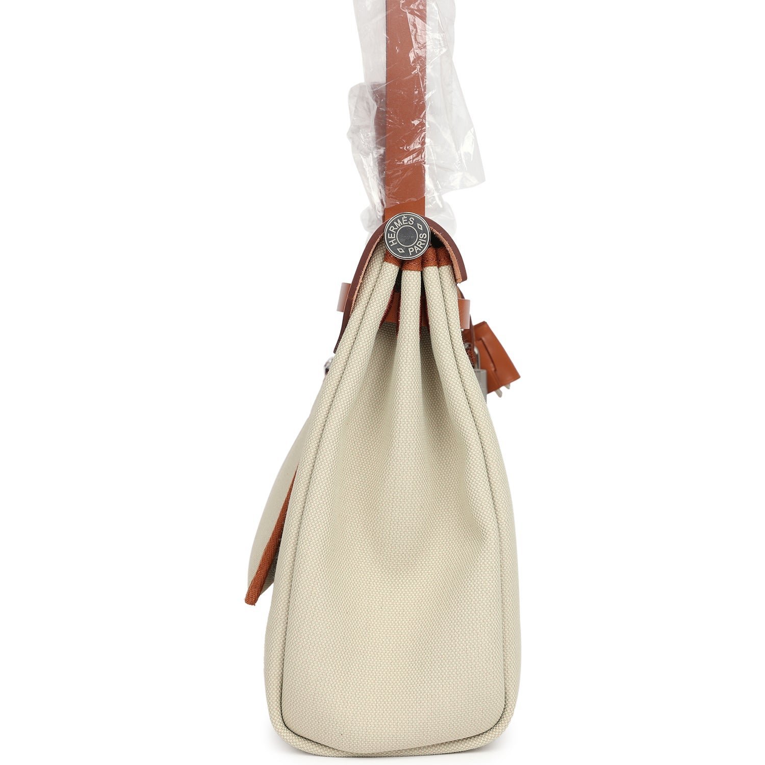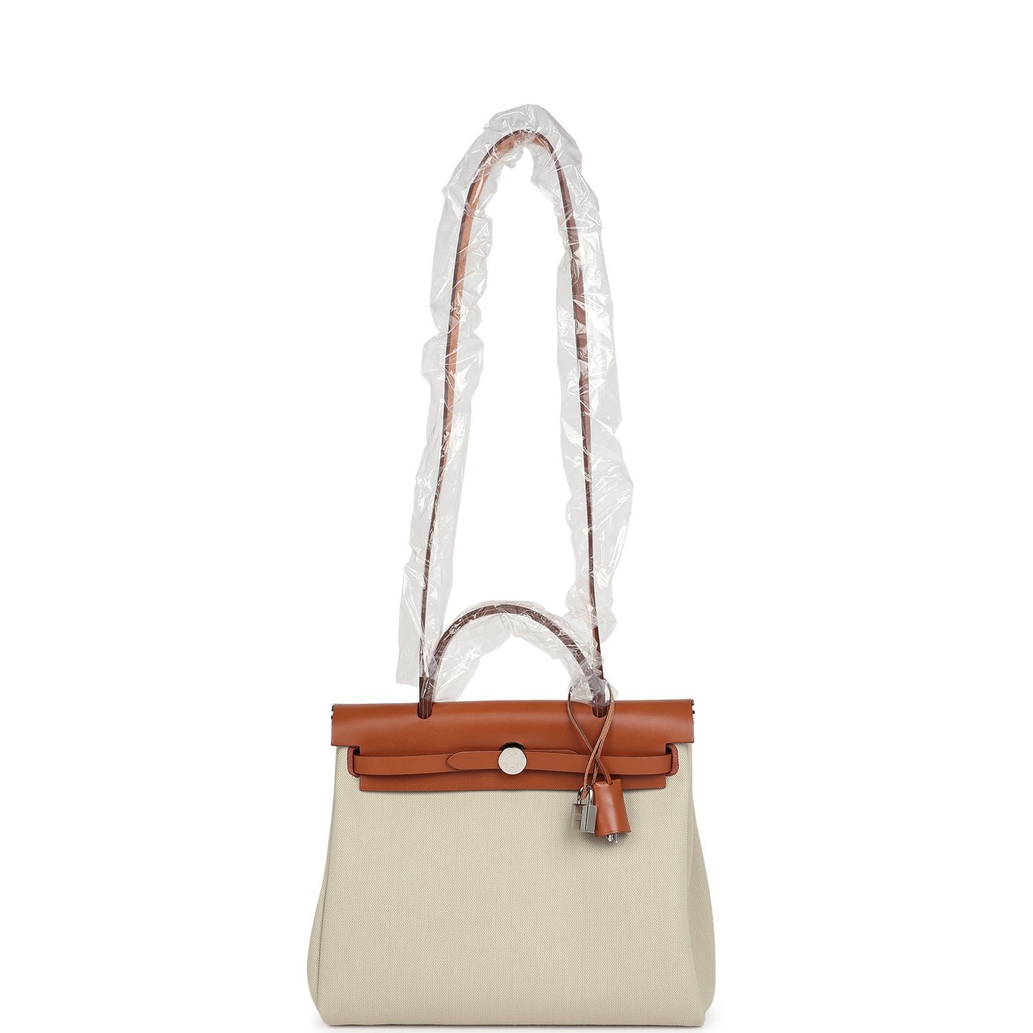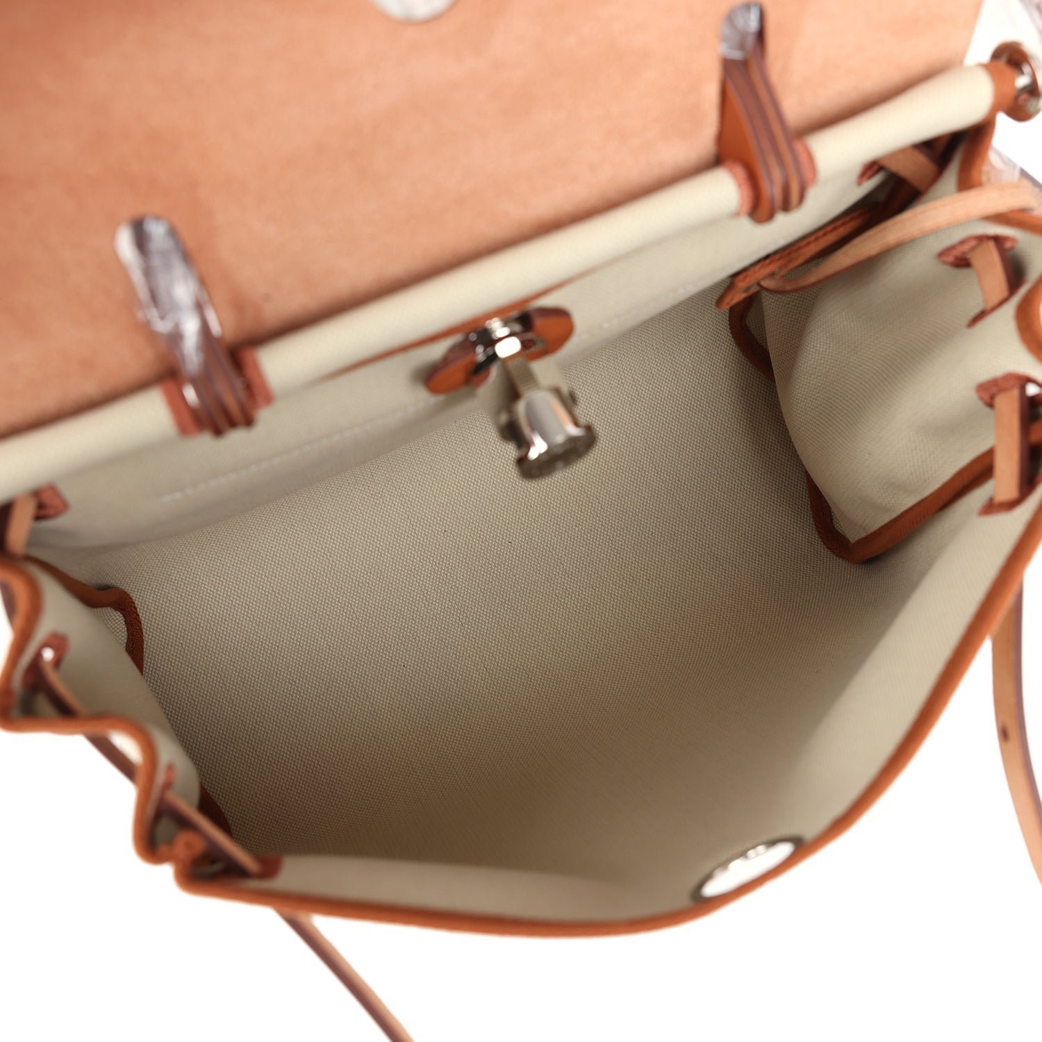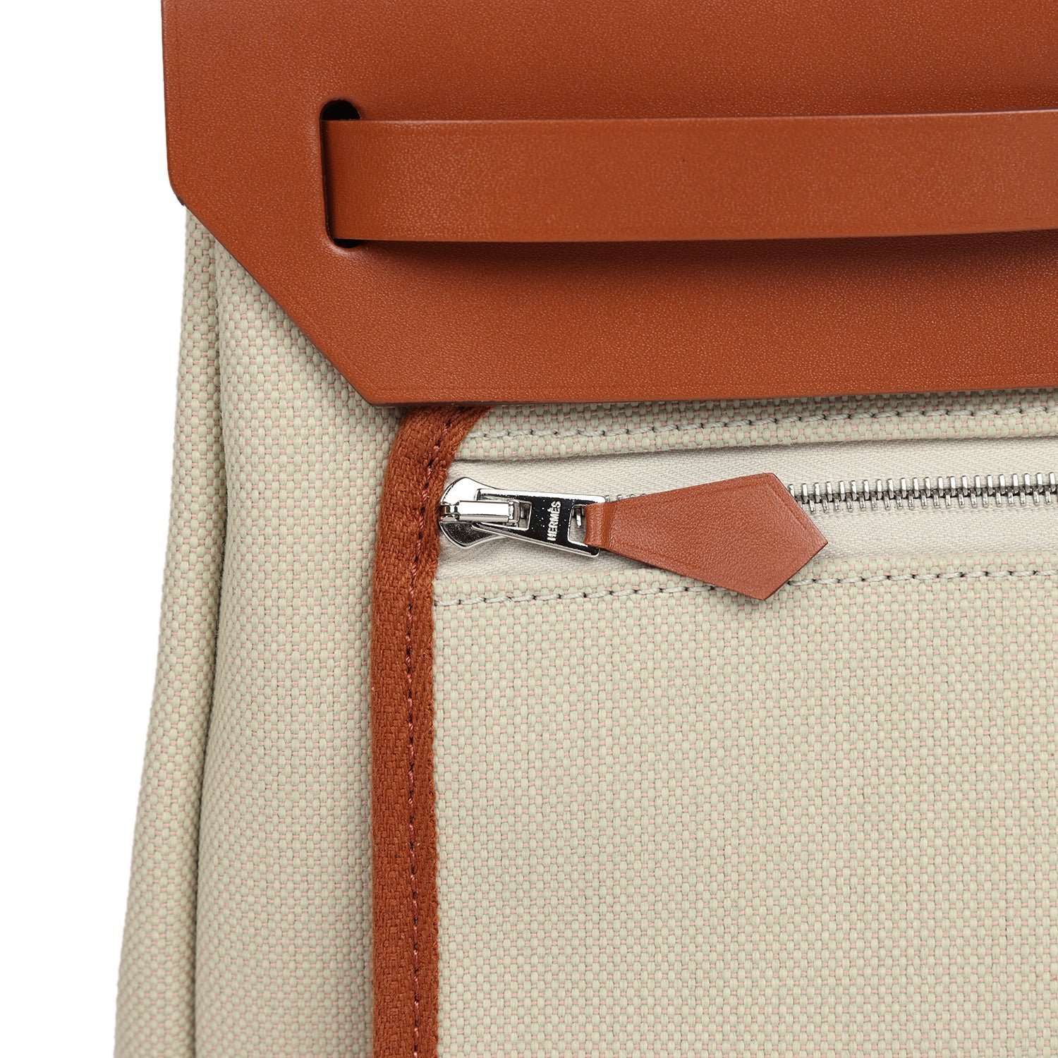 This Herbag Zip 31 is in Beton Toile H canvas and Fauve Vache Hunter leather with palladium hardware and has tonal stitching, clou de selle closure, top handle and shoulder strap in hunter leather, clochette, interior zip pouch and zip pocket on exterior.