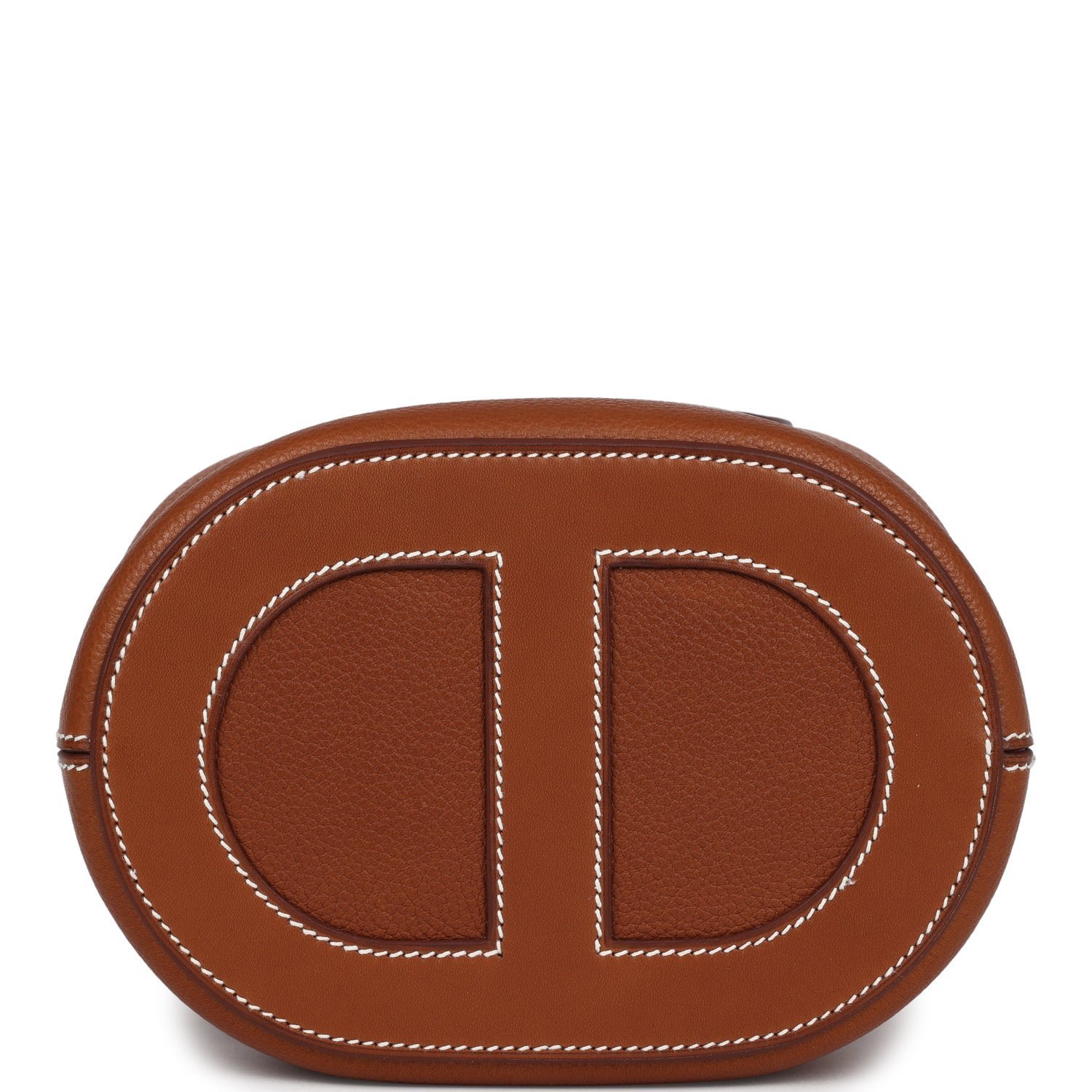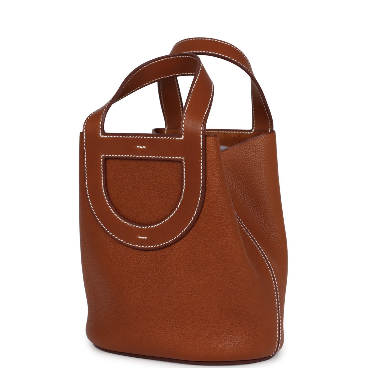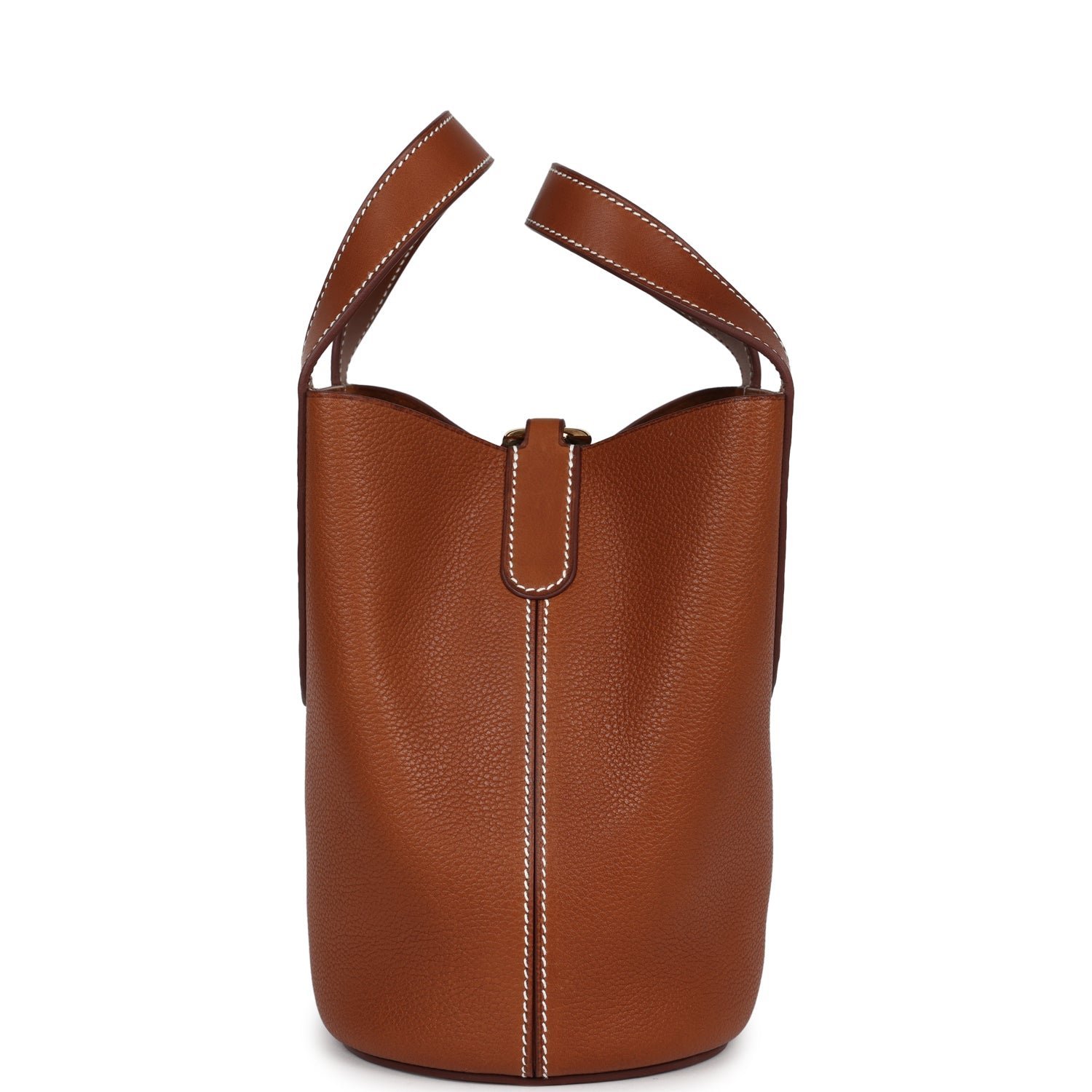 This In-The-Loop 18 is in Fauve Barenia Faubourg leather with gold hardware and has contrast stitching, two Chaine d’Ancre shaped handles, single interior pocket, and Chaine d’Ancre shaped hook closure.