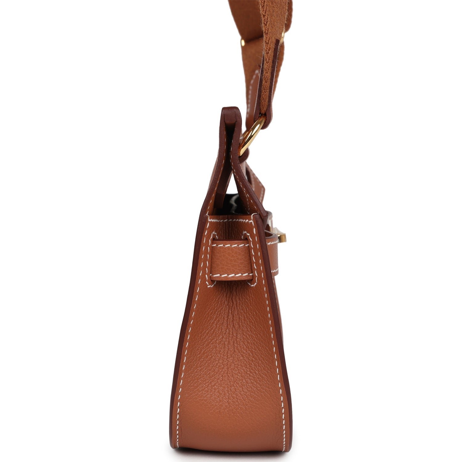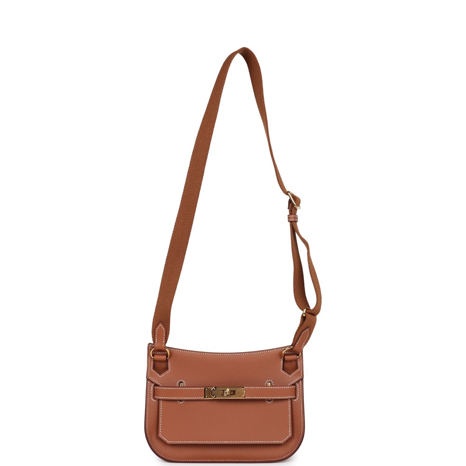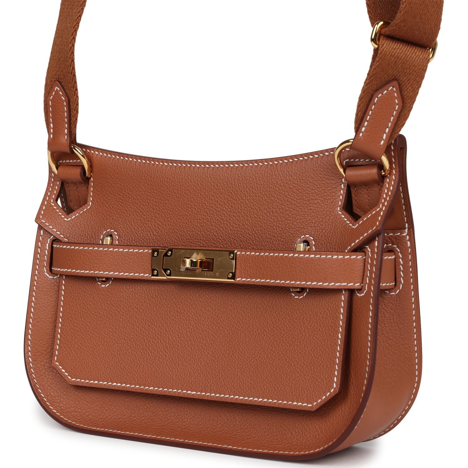 This Jypsiere mini is in Gold evercolor leather with gold hardware and has contrast stitching, a single flap, two pull straps, turnlock closure, and an adjustable wooly shoulder strap.