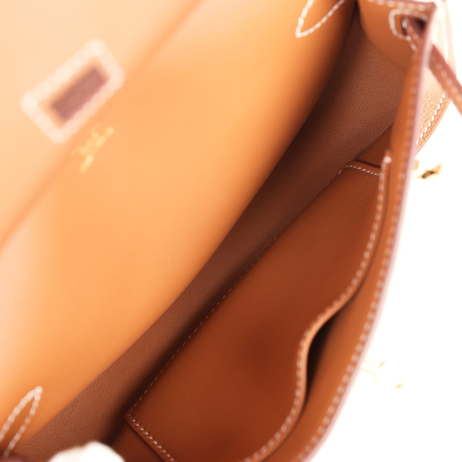 The interior is lined with Gold lambskin and has one open pocket on the front wall.