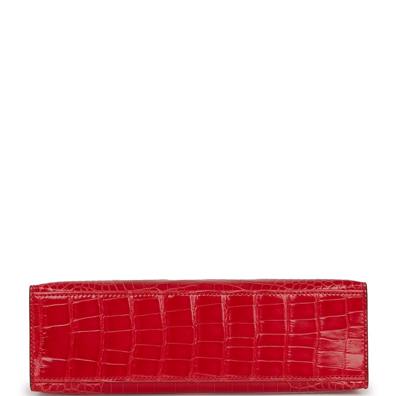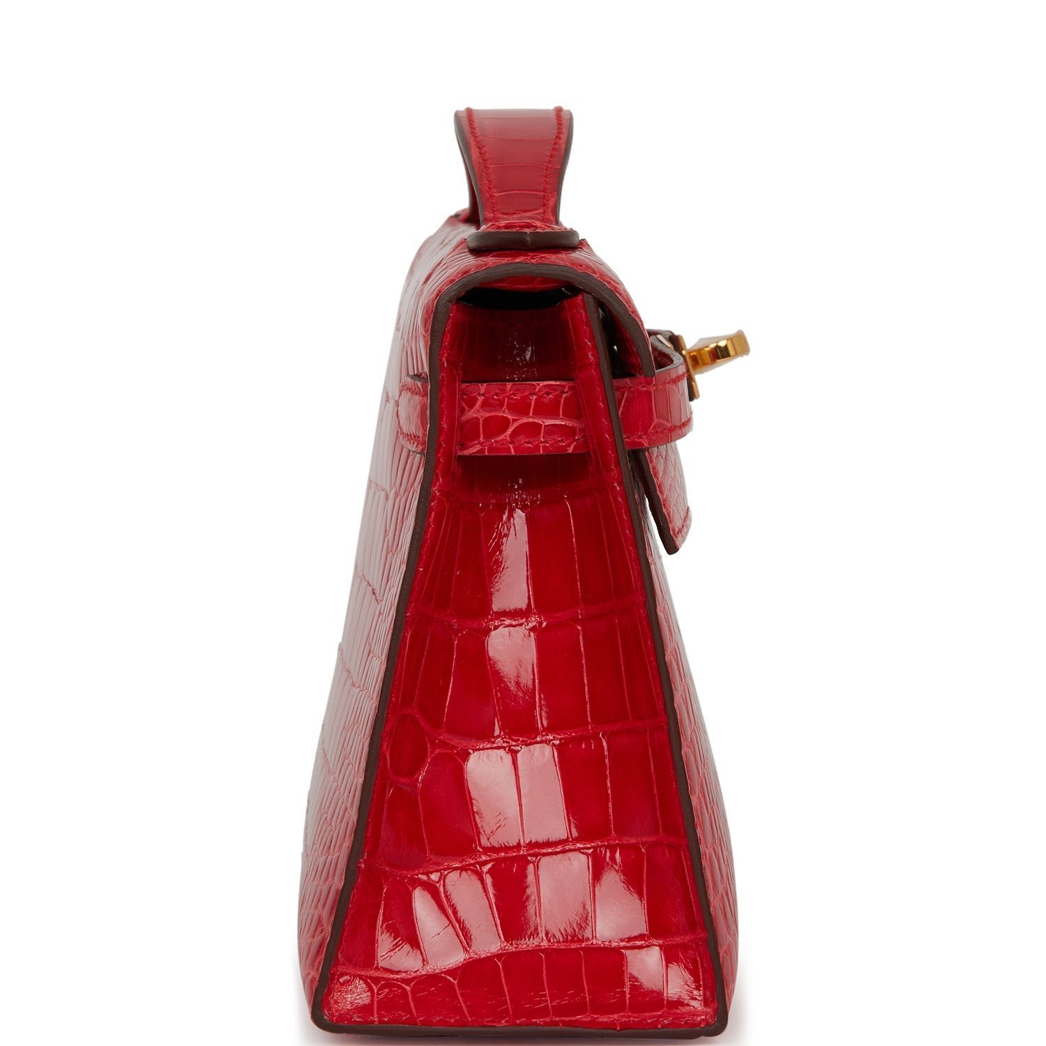 This Mini Kelly Pochette is in Rouge de Coeur shiny Mississippiensis alligator with gold hardware and has tonal stitching, front flap, two straps with center toggle closure and a top flat handle.