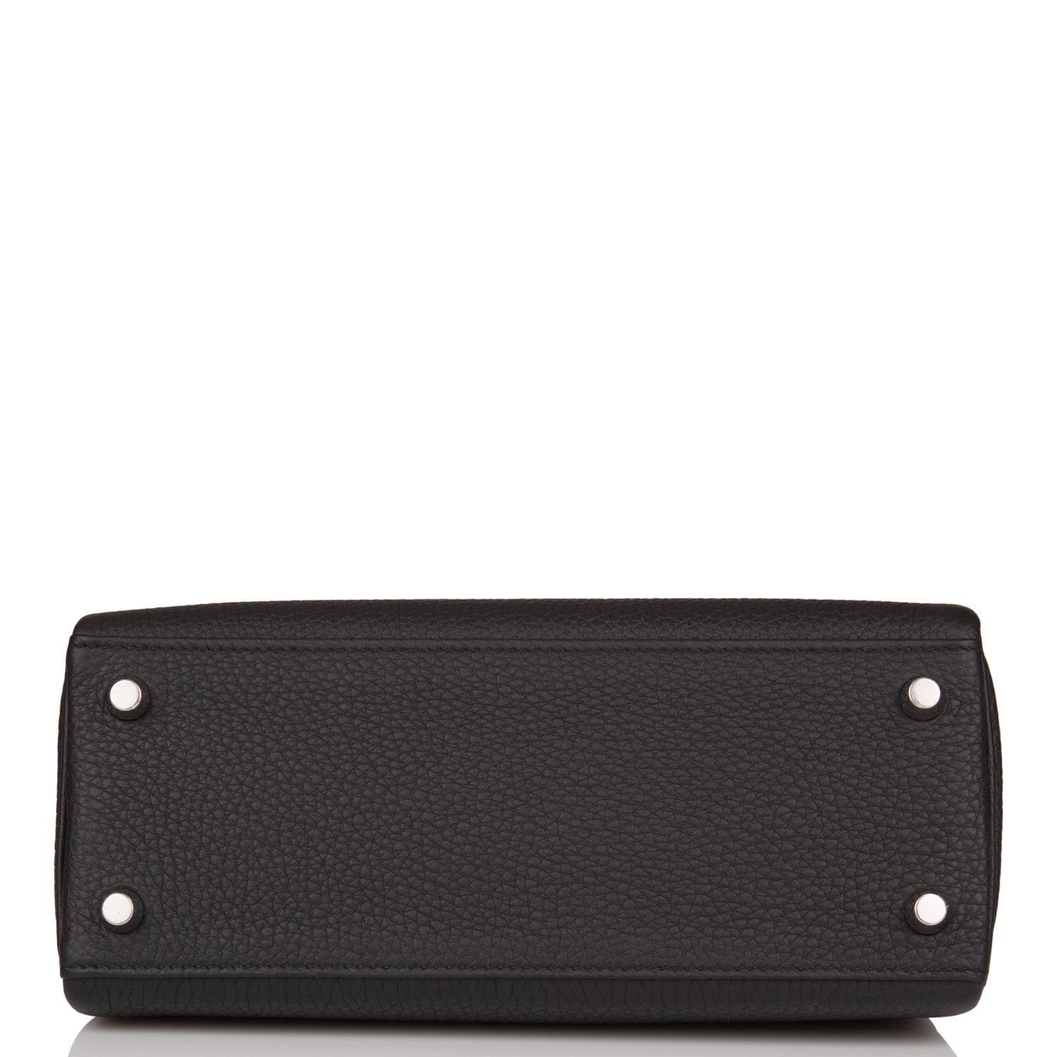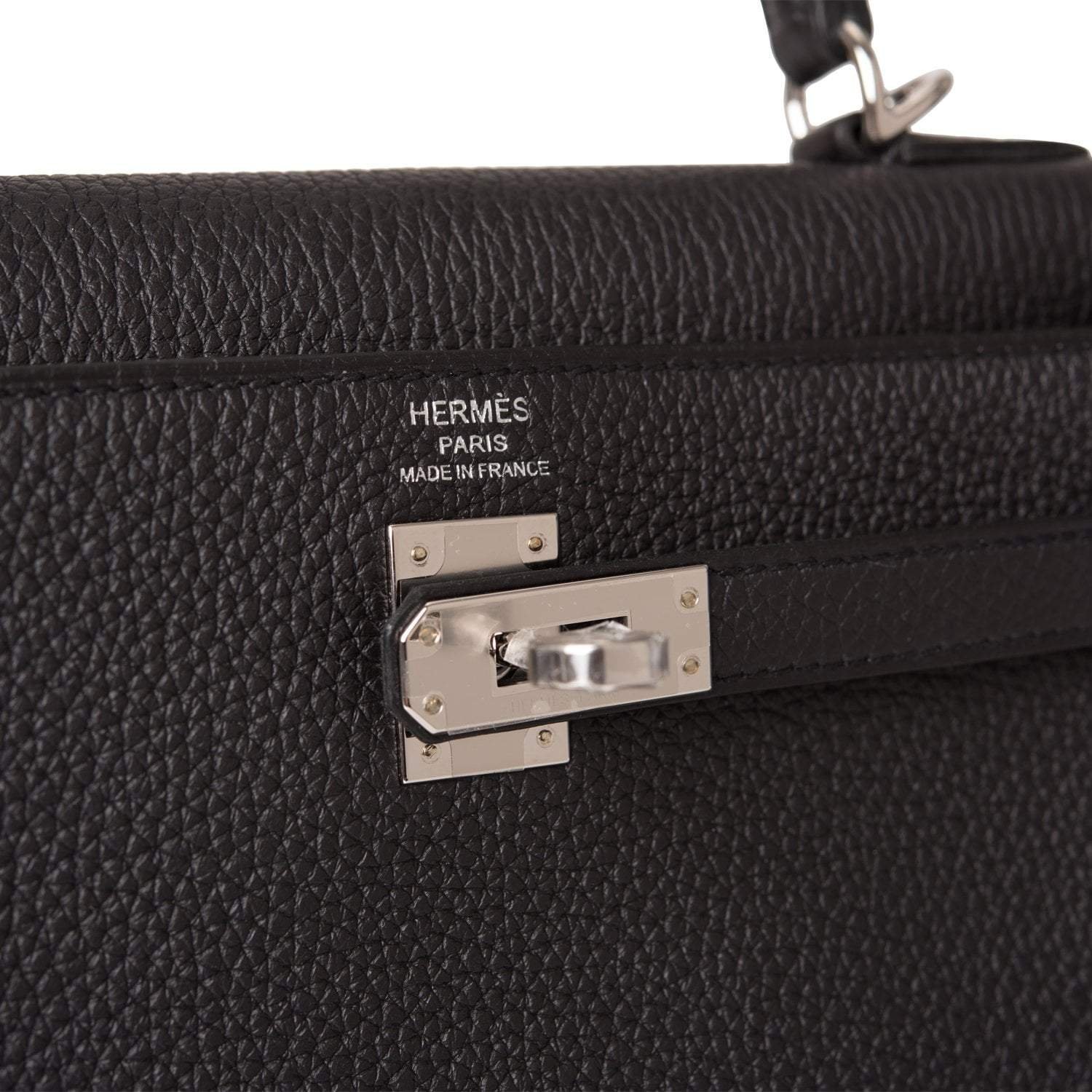 This Retourne Kelly is of black togo leather with palladium hardware and has tonal stitching, front flap, two straps with center toggle closure, clochette with lock and two keys, single rolled handle and an optional shoulder strap.