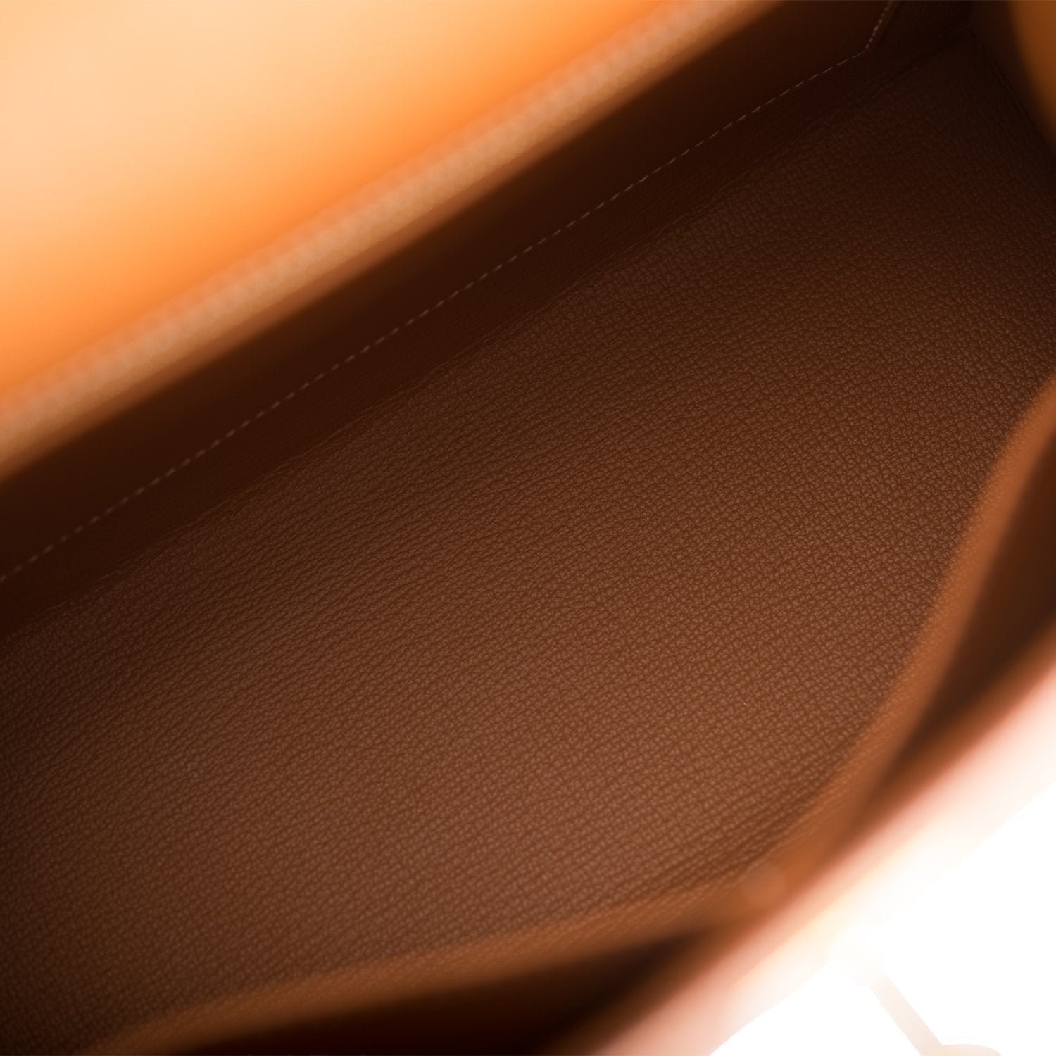The interior is lined with gold chevre leather and has one zip pocket with an Hermes engraved pull and two open pockets on the opposite side.