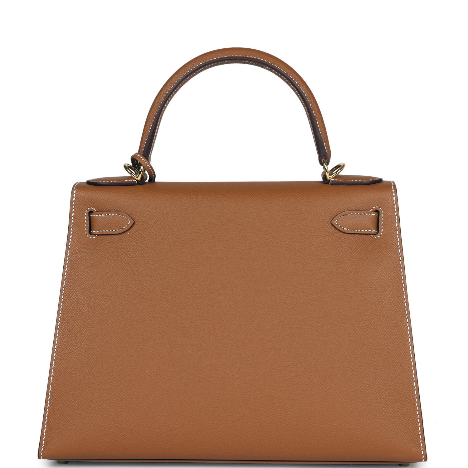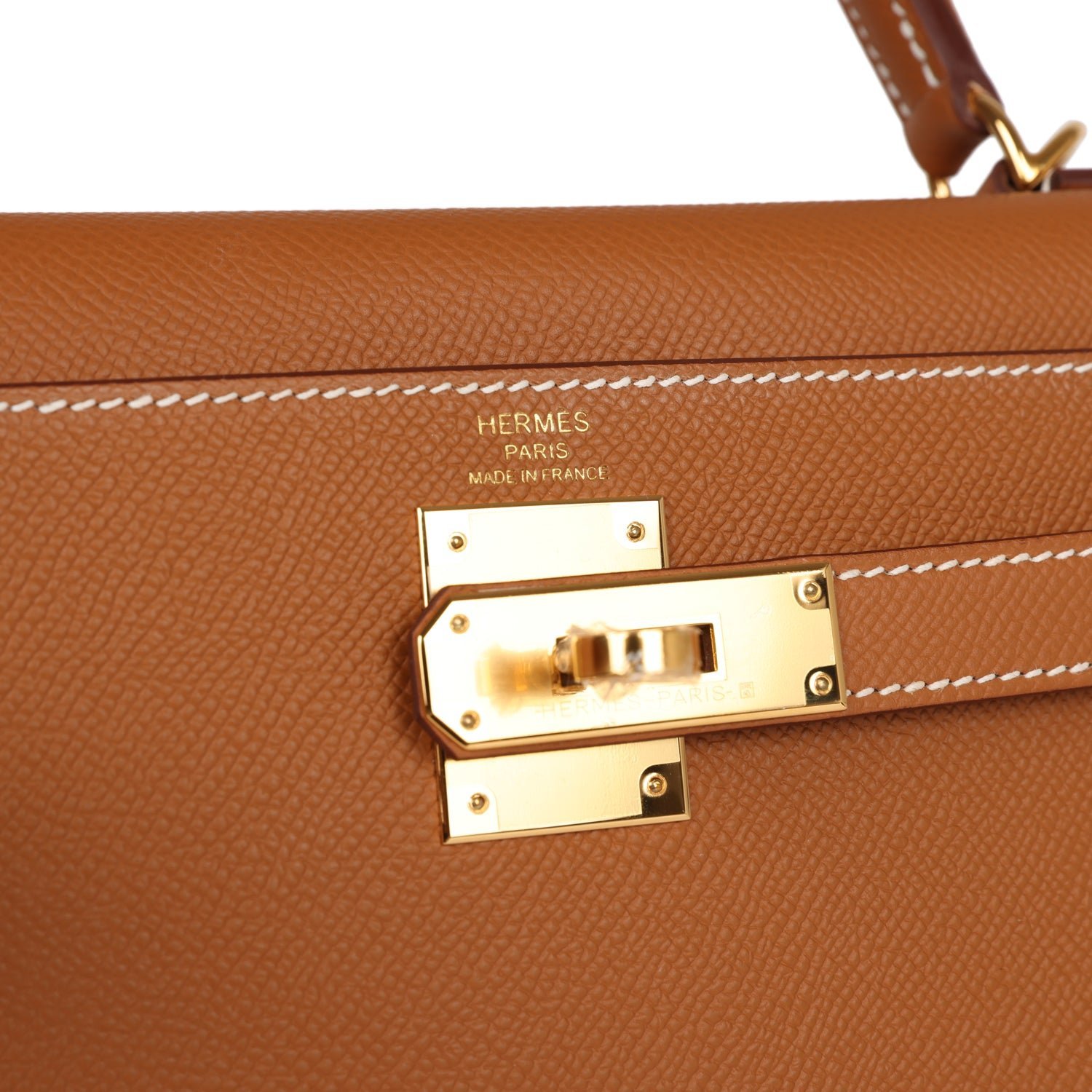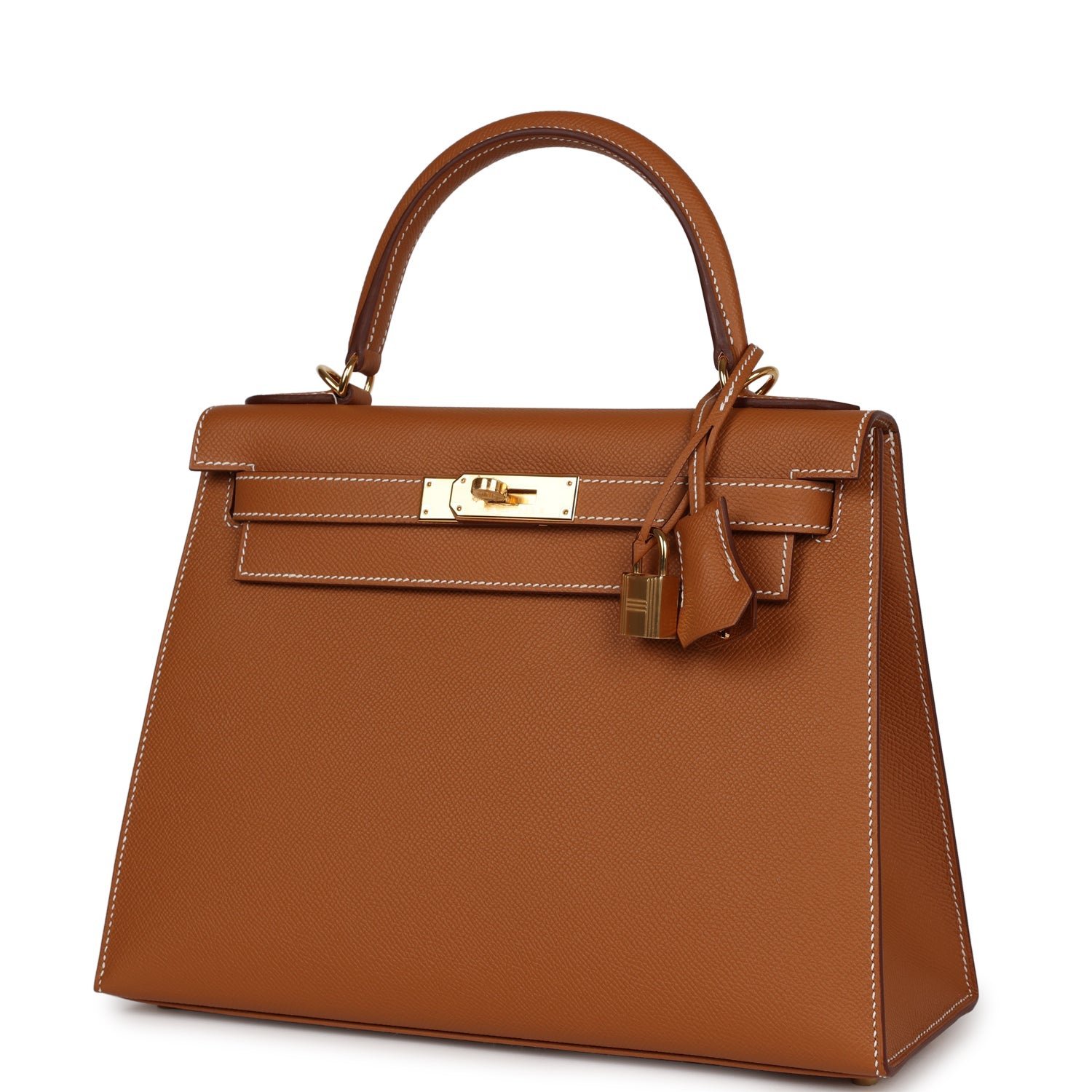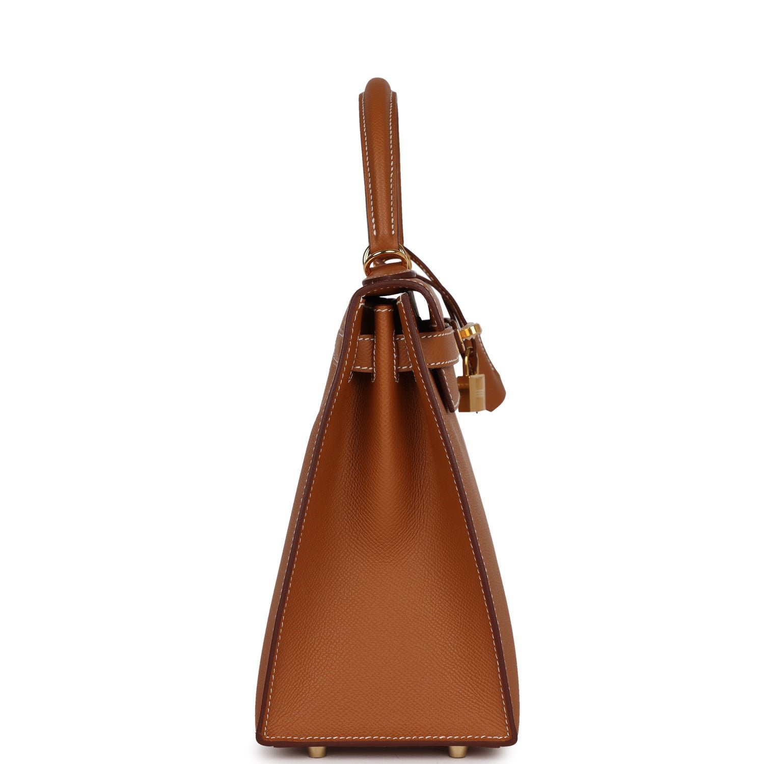 This Kelly, in the Sellier style, is in gold epsom leather with gold hardware and has contrast stitching, front flap, two straps with center toggle closure, clochette with lock and two keys a single rolled handle and removable shoulder strap.