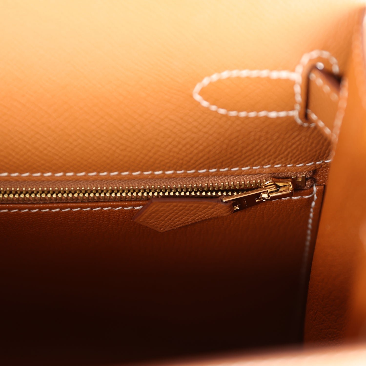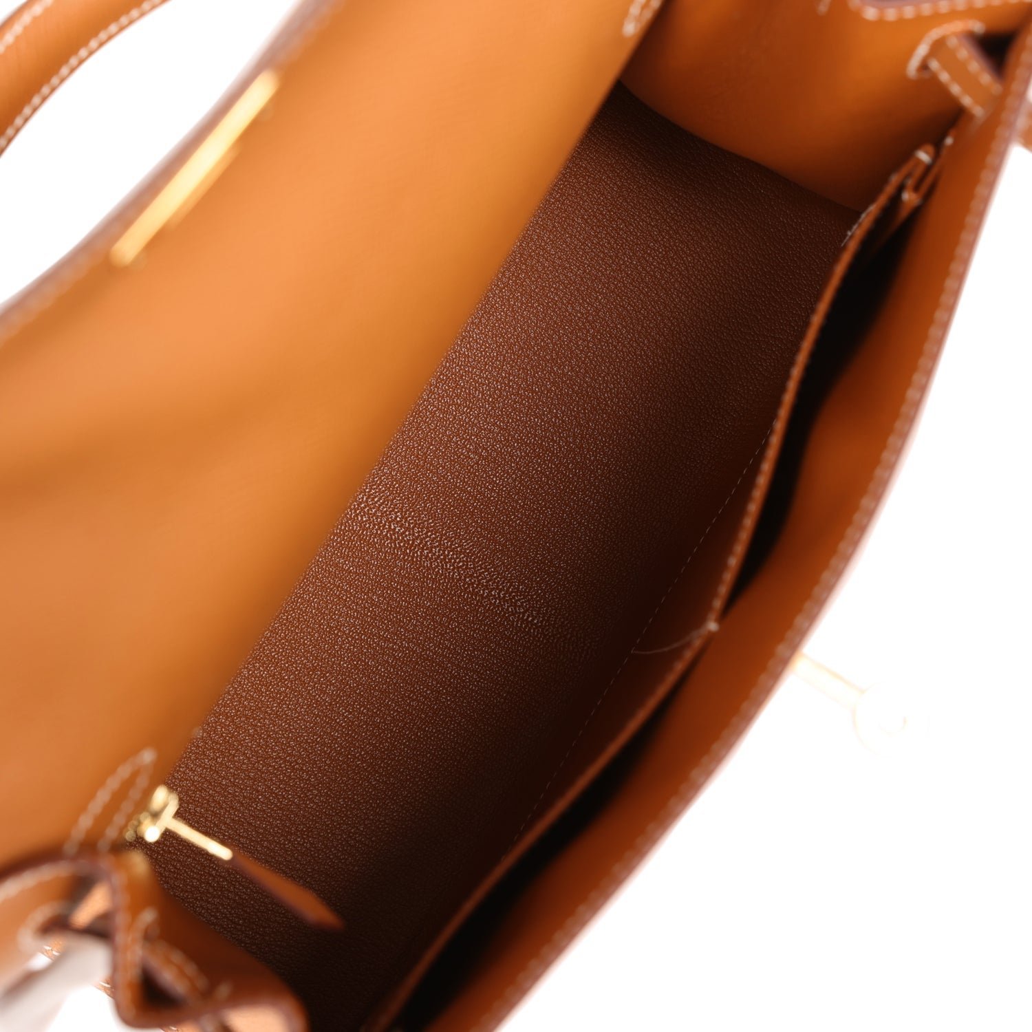 The interior is lined with gold chevre leather and has one zip pocket with an Hermes engraved pull and two open pockets on the opposite side.