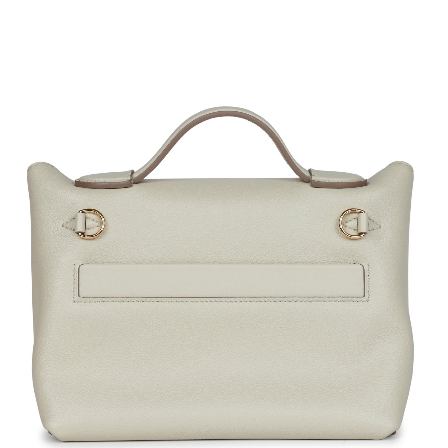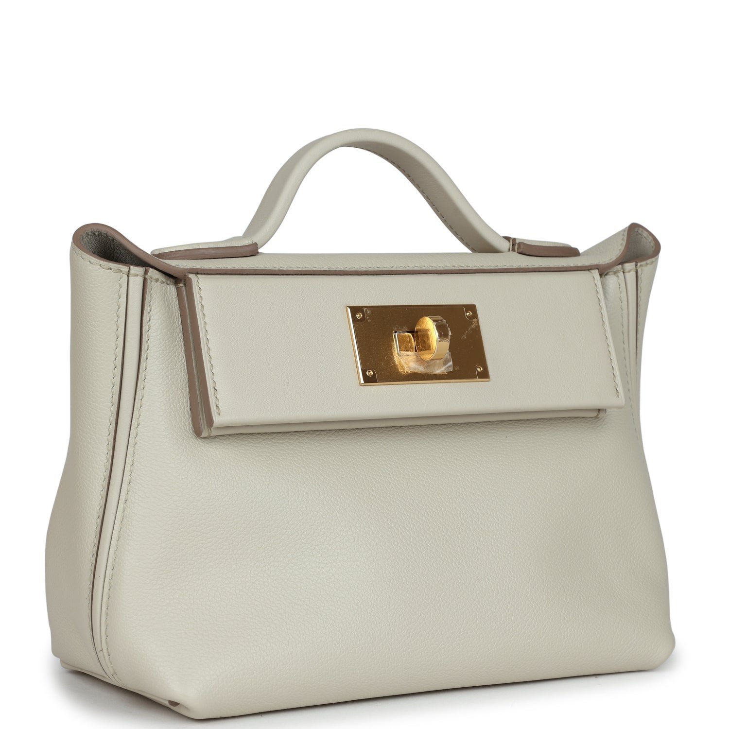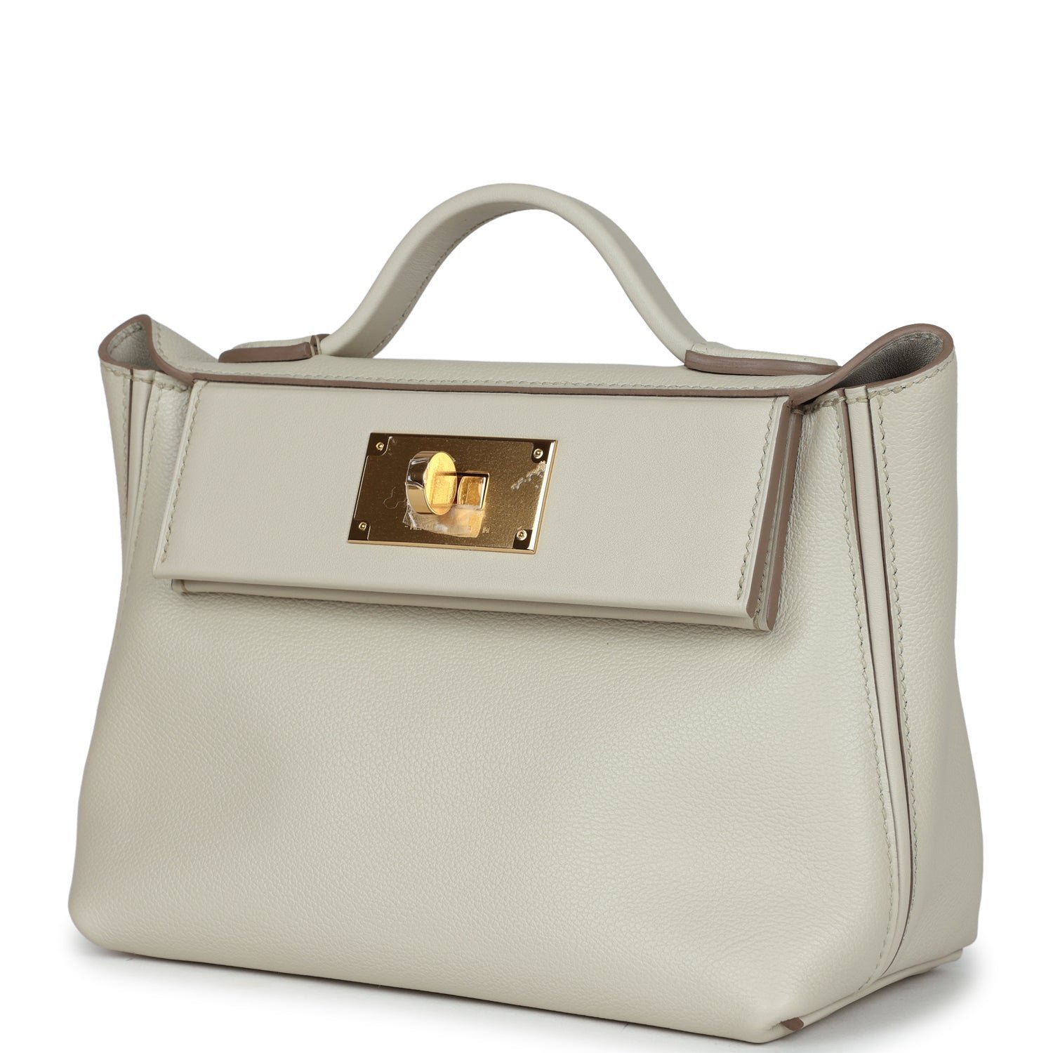 This 24/24 bag is in Beton evercolor and swift leather with gold hardware, has tonal stitching, front turnlock closure, open rear pocket, single flap top handle and removable shoulder strap.