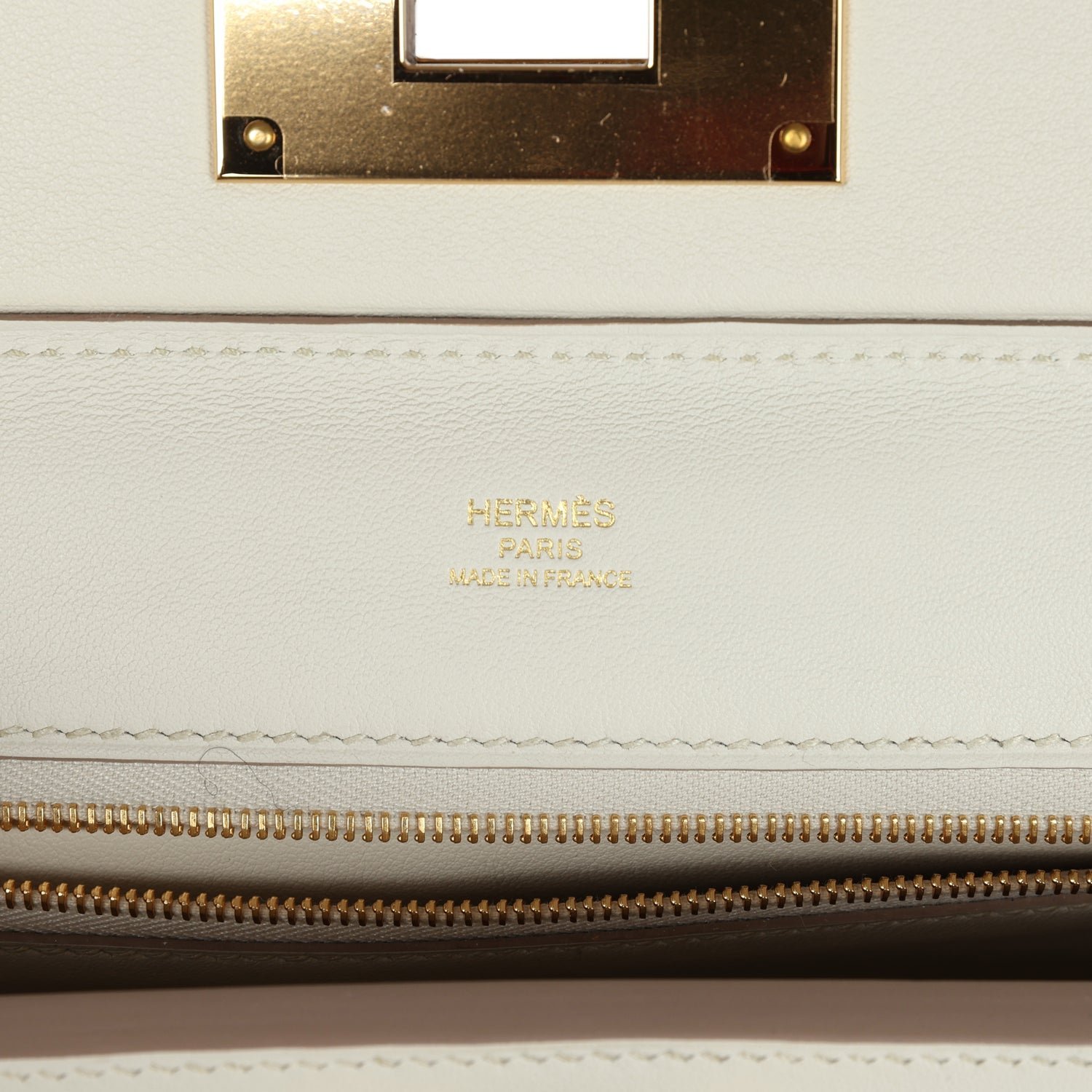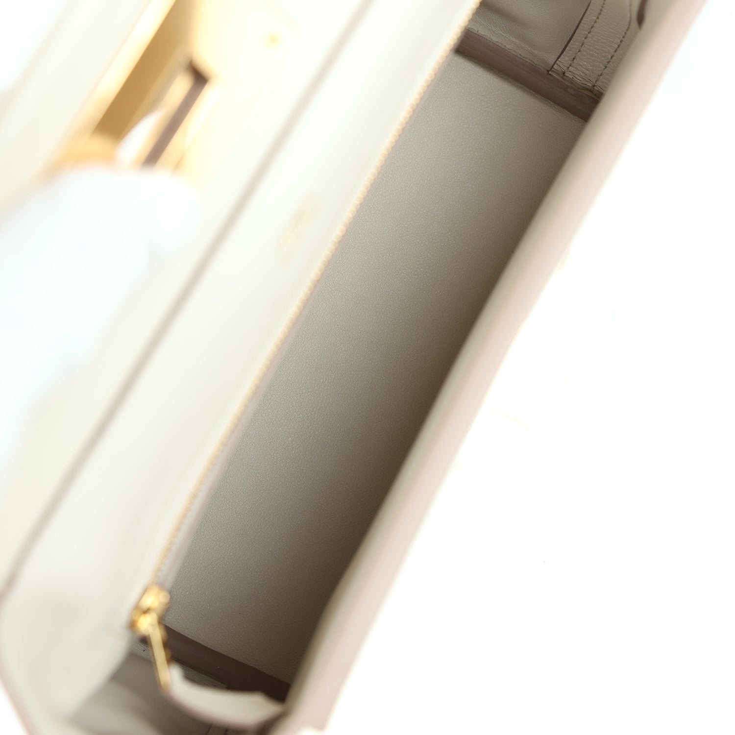 The interior is lined with Beton swift leather and has one zip pocket with an Hermes engraved pull on the back wall.