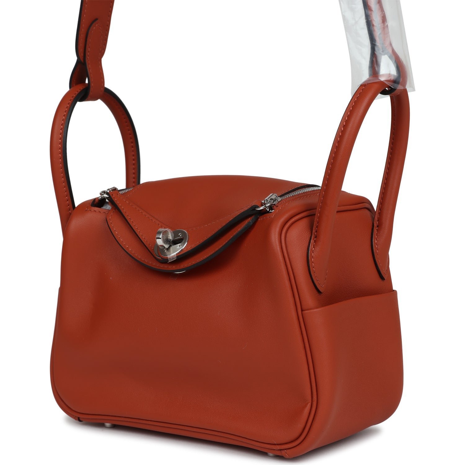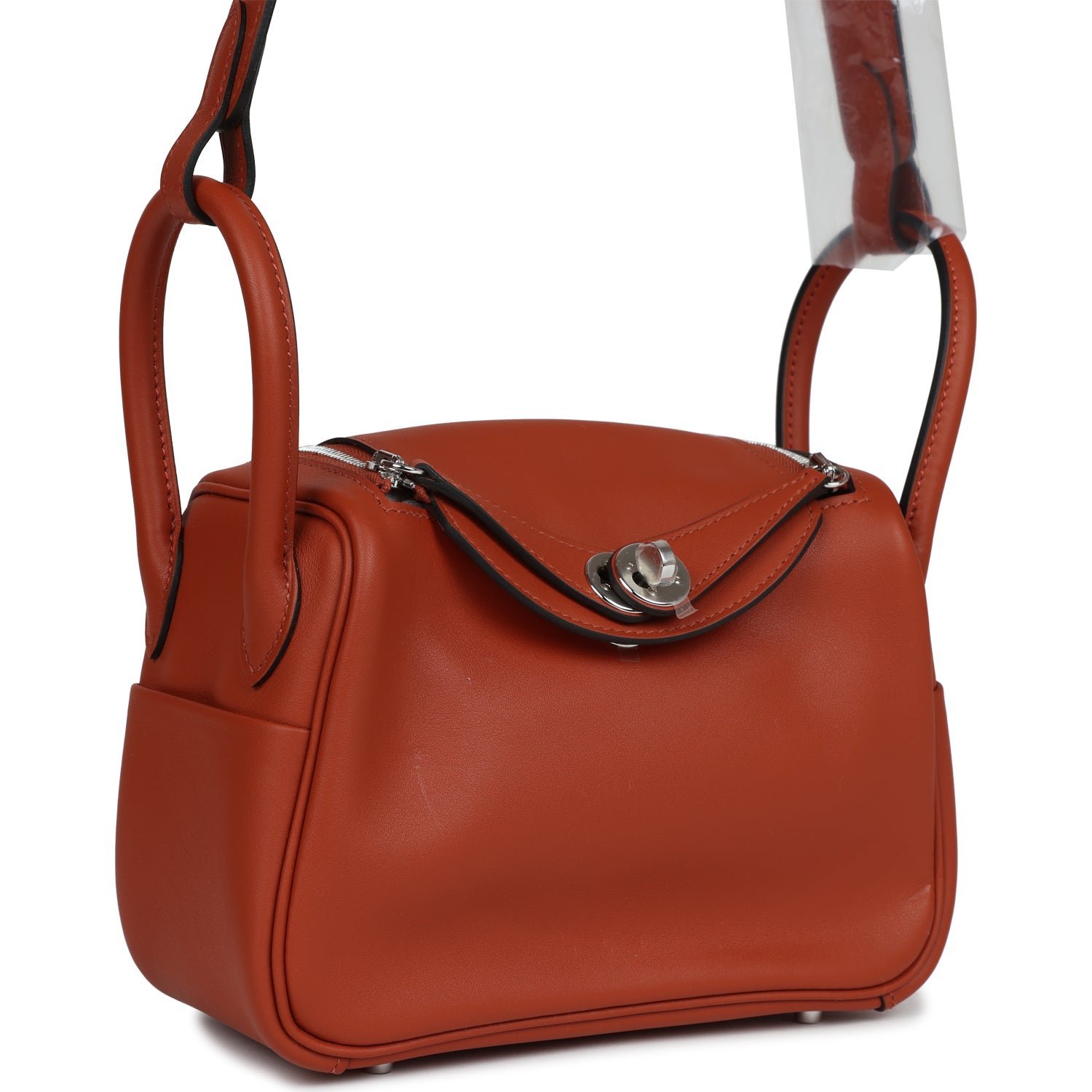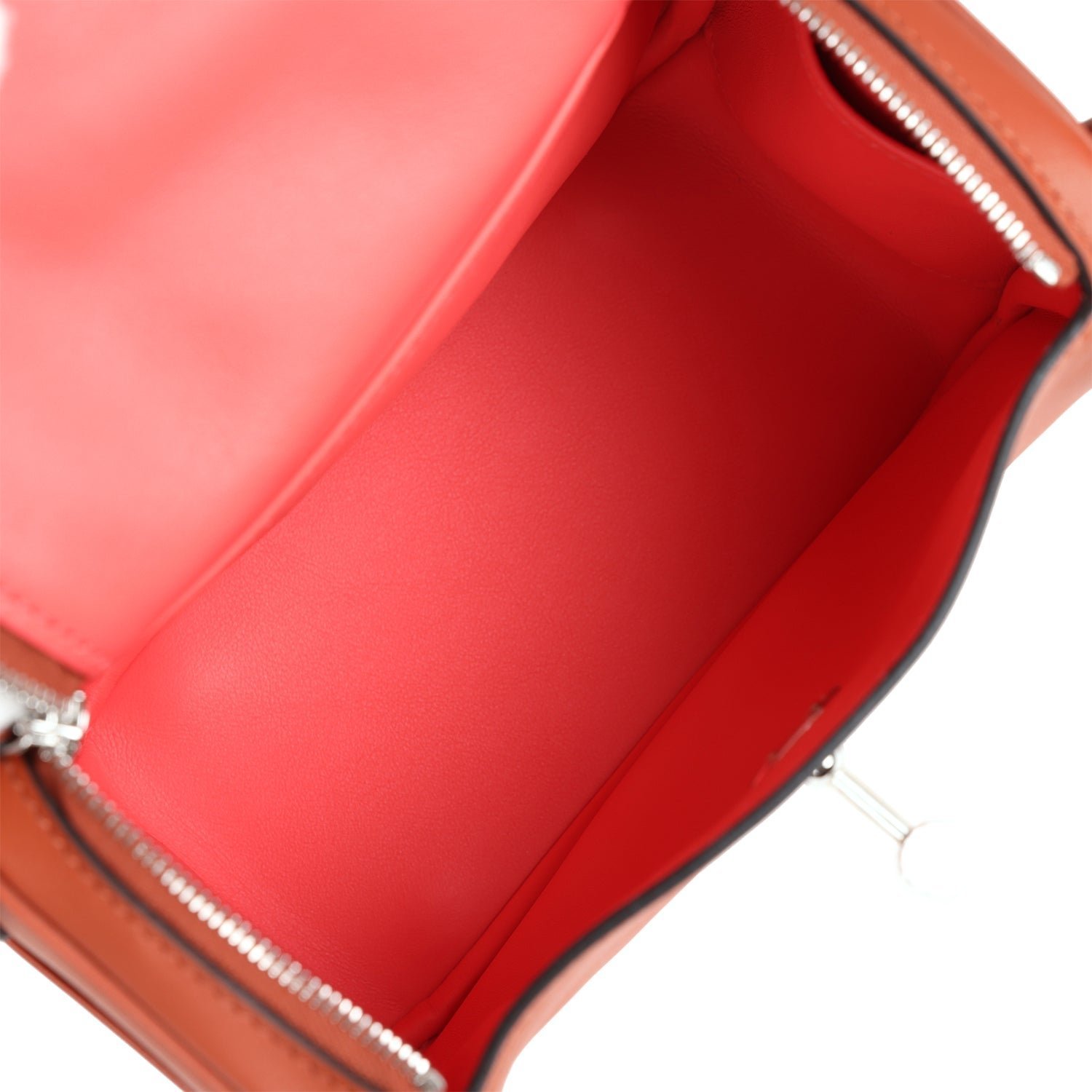 This Mini Lindy is in Cuivre swift leather with palladium hardware and has tonal stitching, double zipper pulls, front Hermès twist lock, single pocket on each side, two rolled top handles linked by a flat shoulder strap.