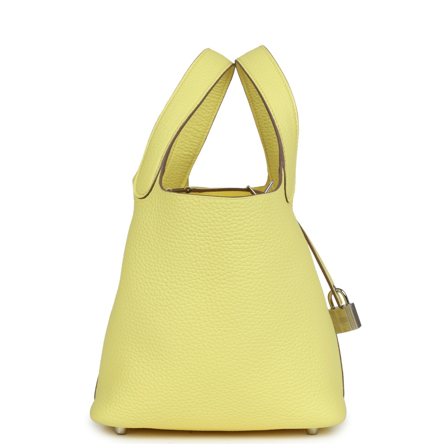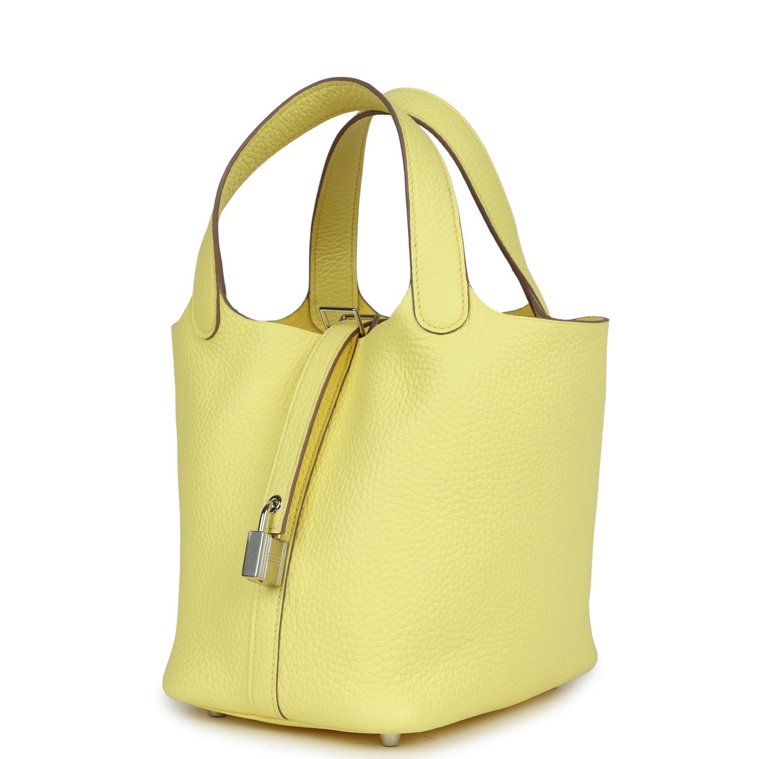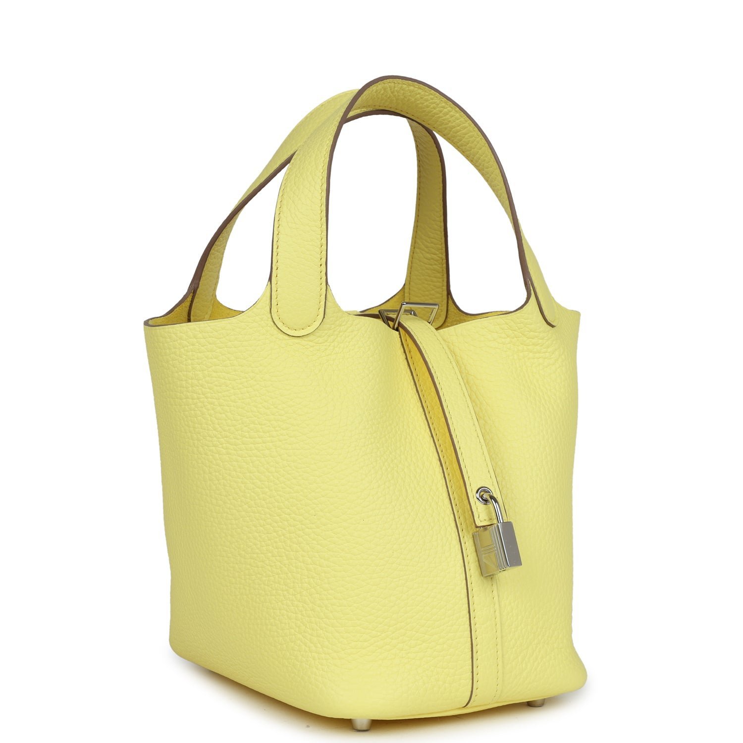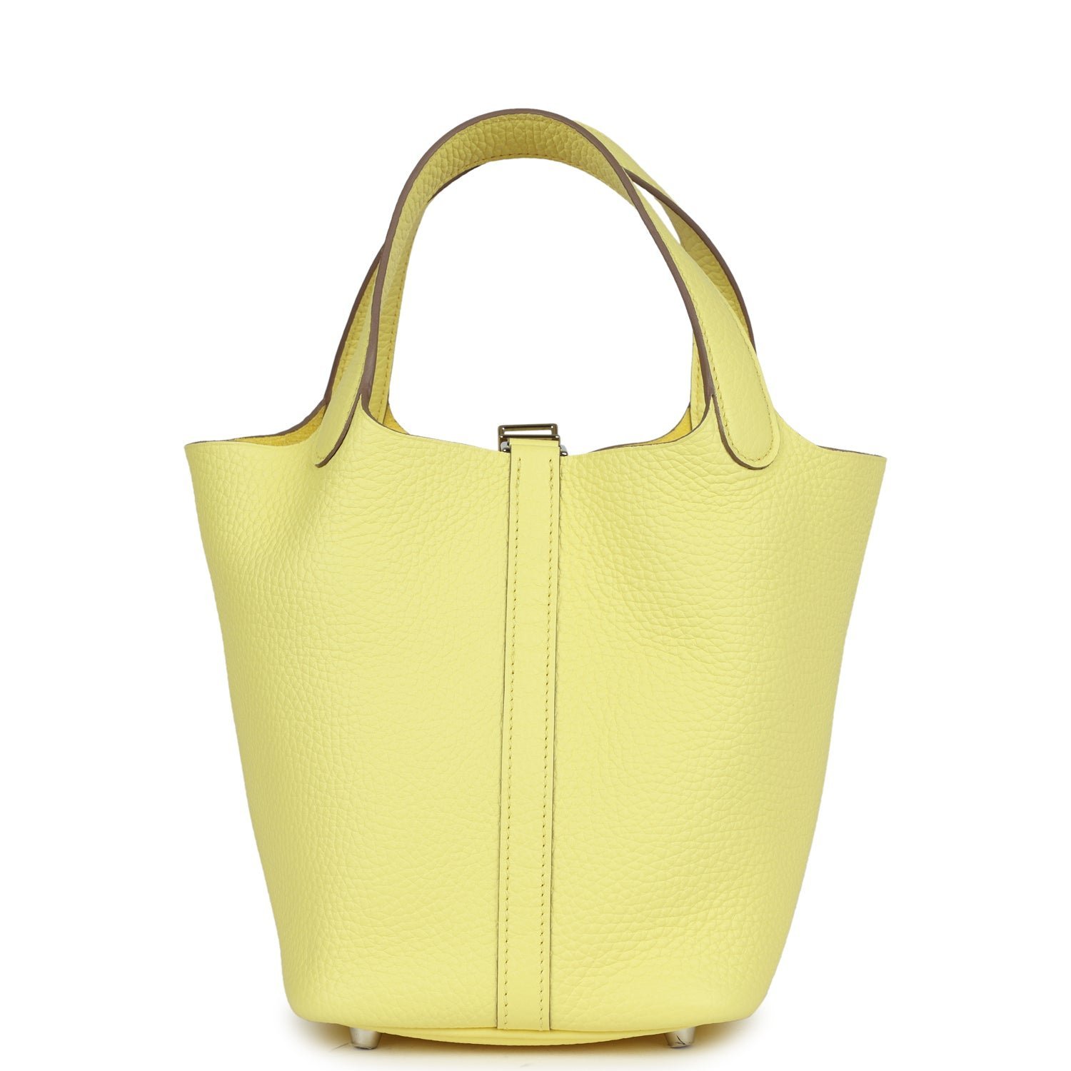 This Picotin is in Limoncello clemence leather with palladium hardware and has tonal stitching with two top handles.