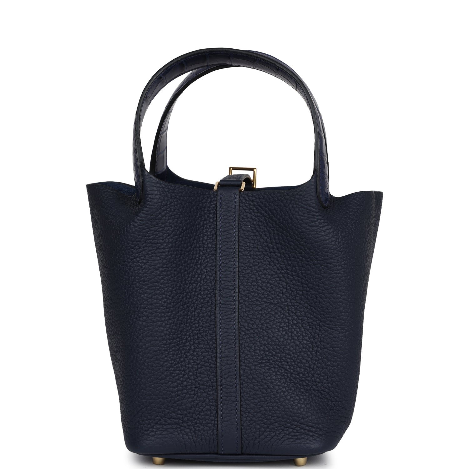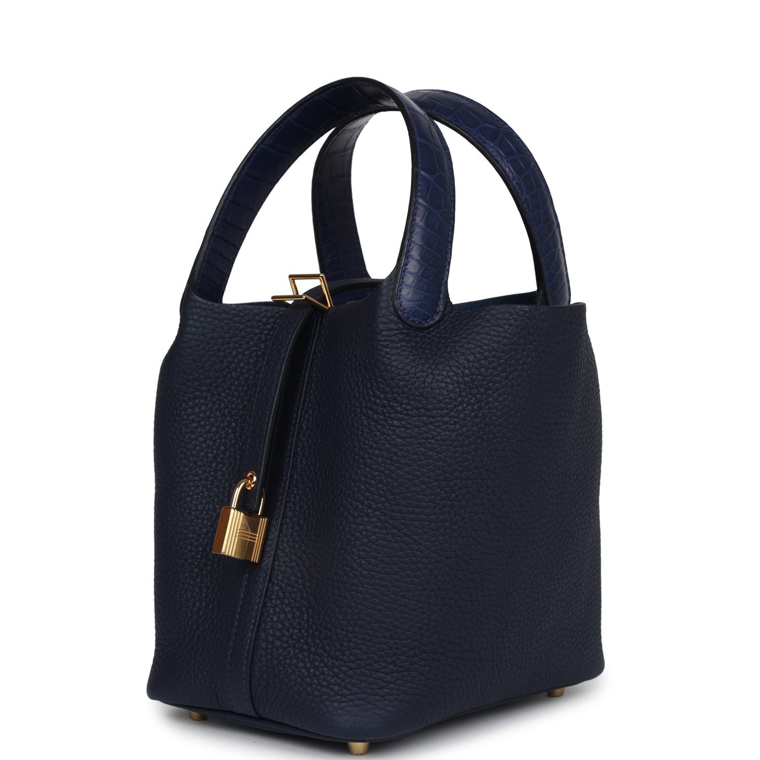 This Picotin 18 Lock Touch is in Bleu Nuit Clemence and Bleu Marine Mississippiensis Alligator leather with gold hardware, tonal stitching and two top handles.