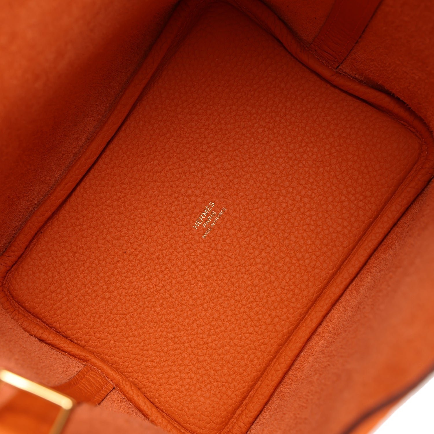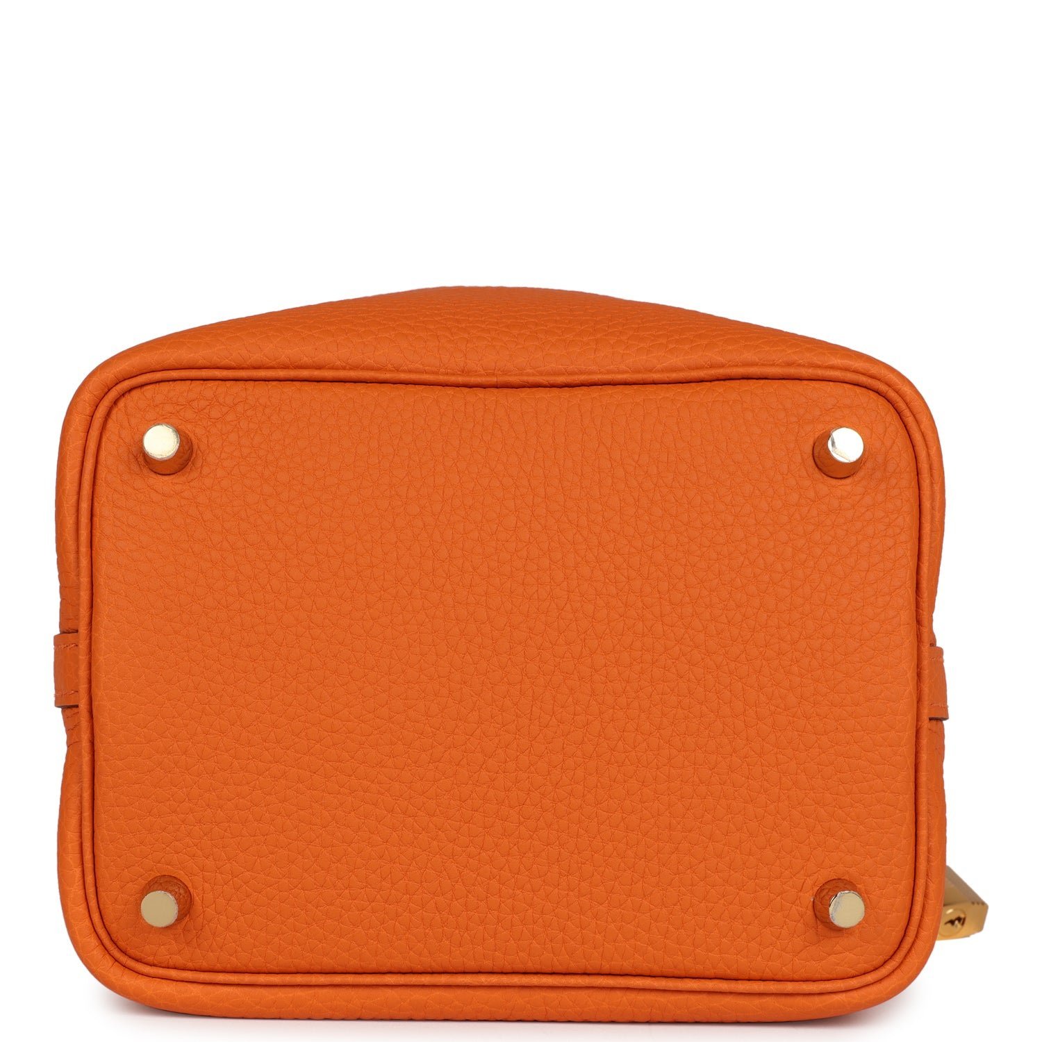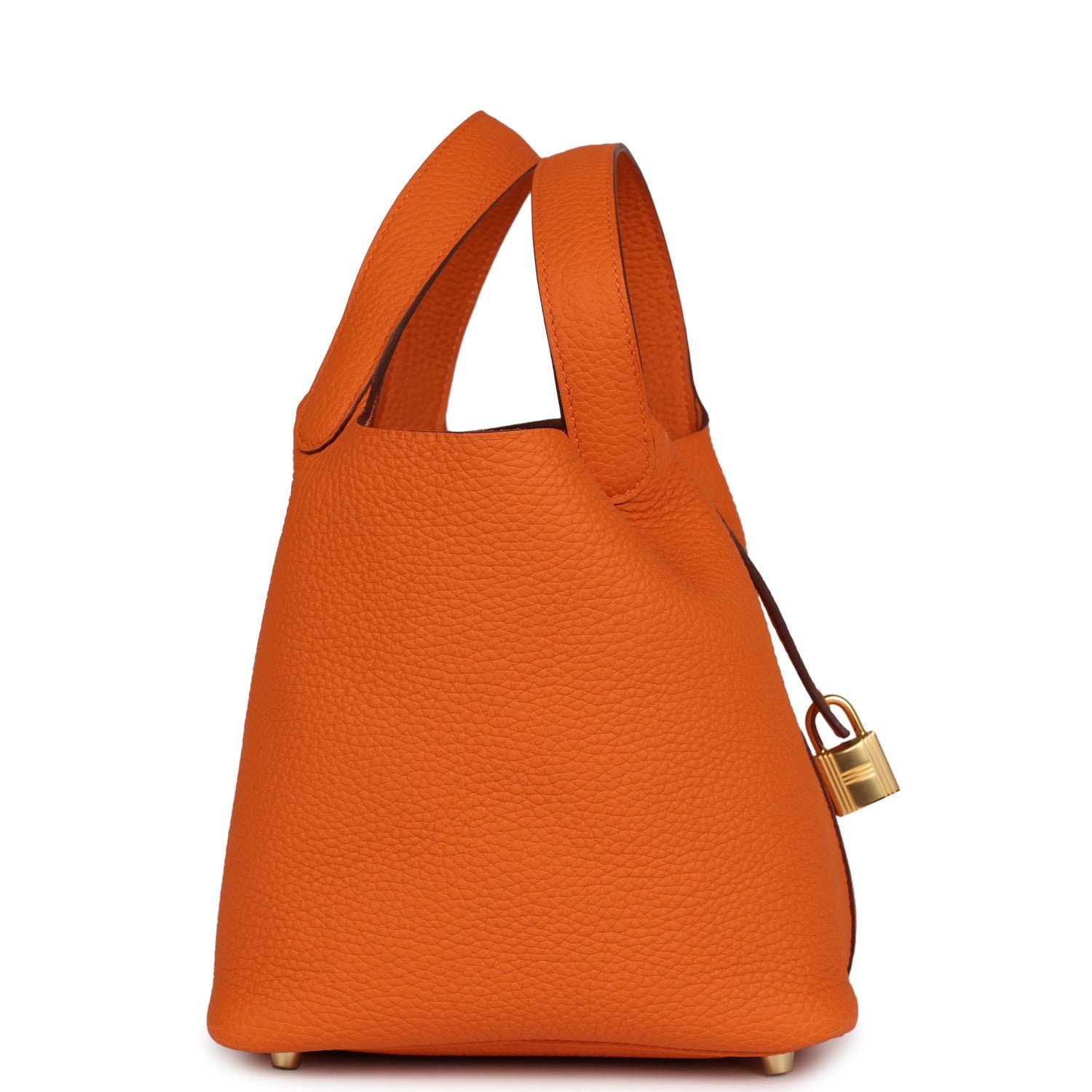 This Picotin Lock is in Orange clemence leather with gold hardware and has tonal stitching with two top handles.