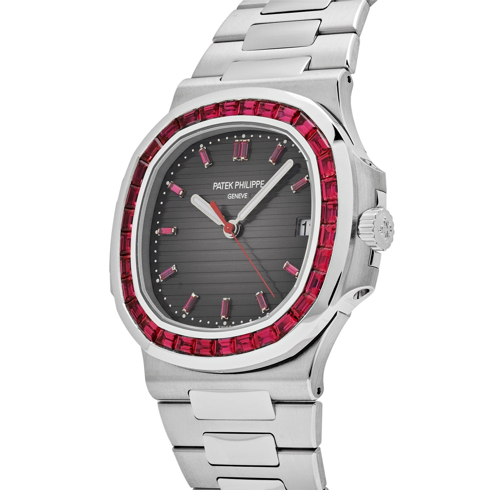 This Patek Philippe Nautilus 5711/112P-001 is designed in a 40mm platinum case and styled on a platinum bracelet. The bezel is adorned with 32 baguette rubies and surrounds a grey dial with luminous hands, baguette ruby hour markers, and a date window at 3 o’clock. This rare timepiece is coveted among collectors and is certainly a treasure.