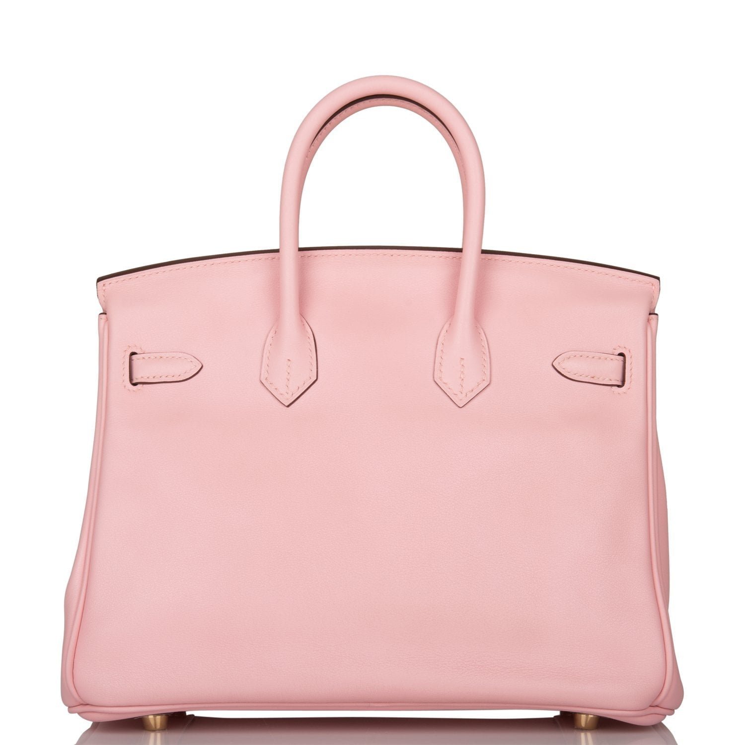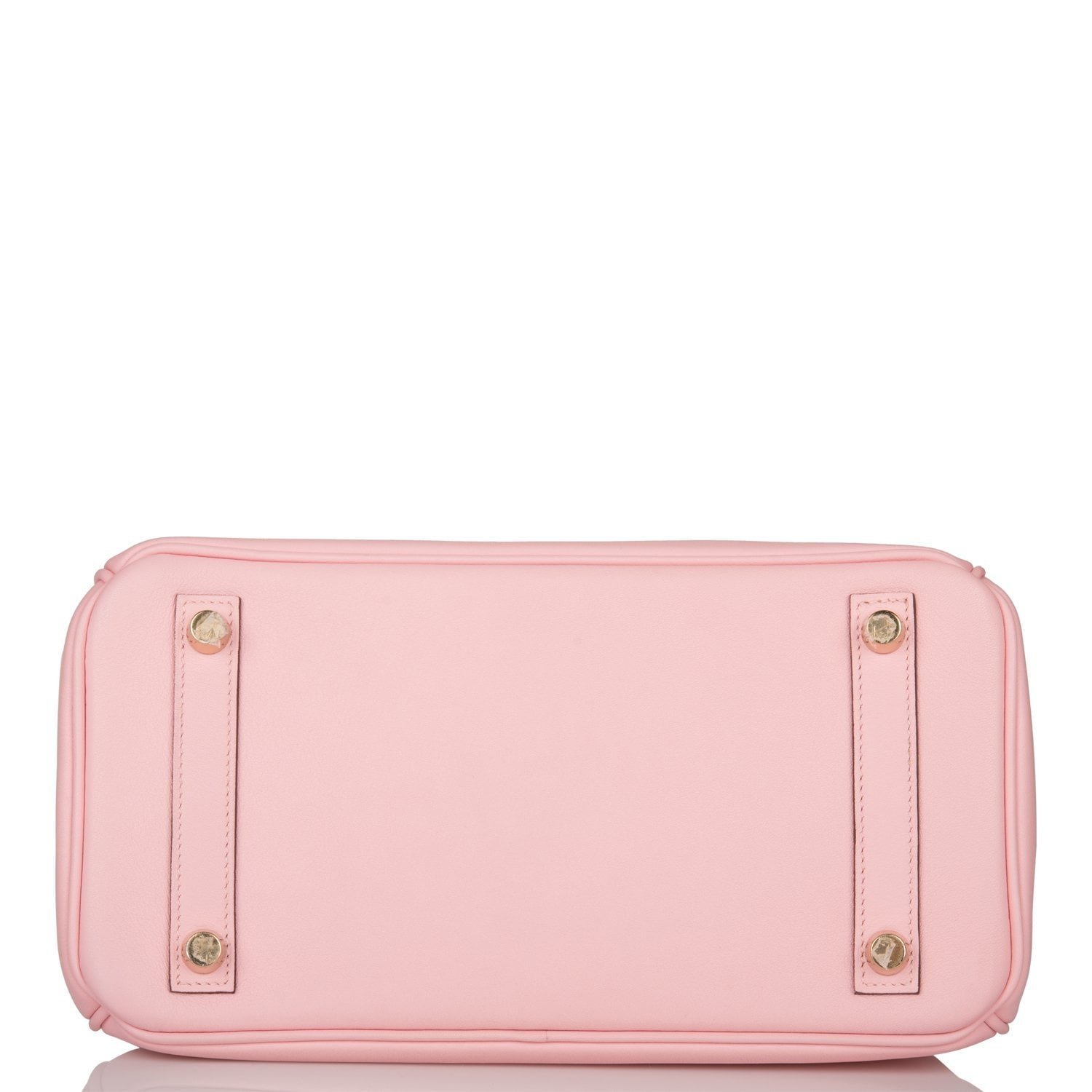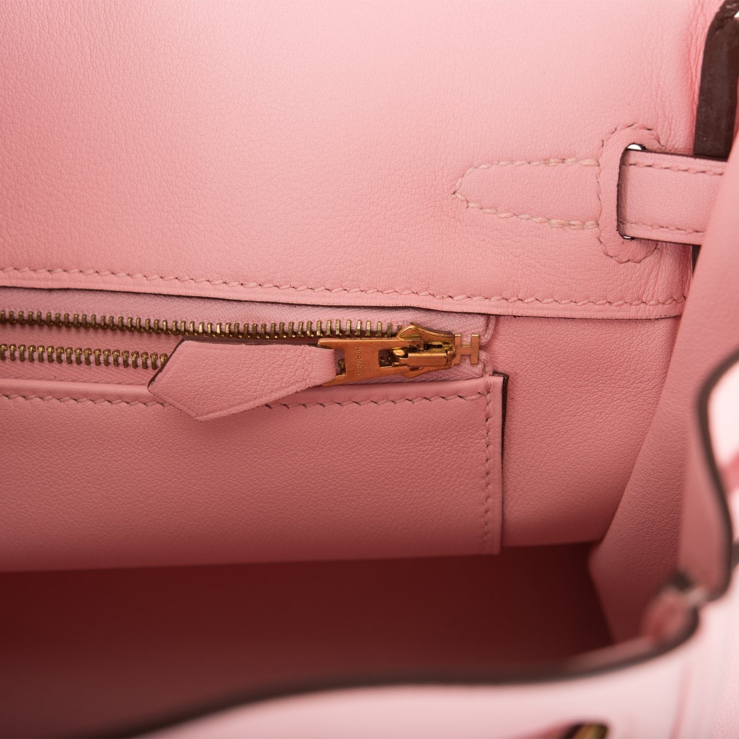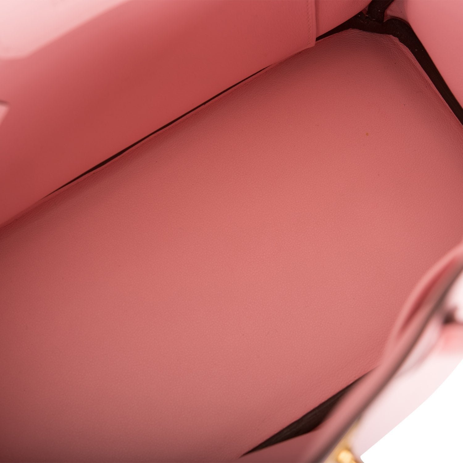 This Birkin is of Rose Sakura swift with gold hardware and features tonal stitching, front flap, two straps with center toggle closure, clochette with lock and two keys, and double rolled handles.