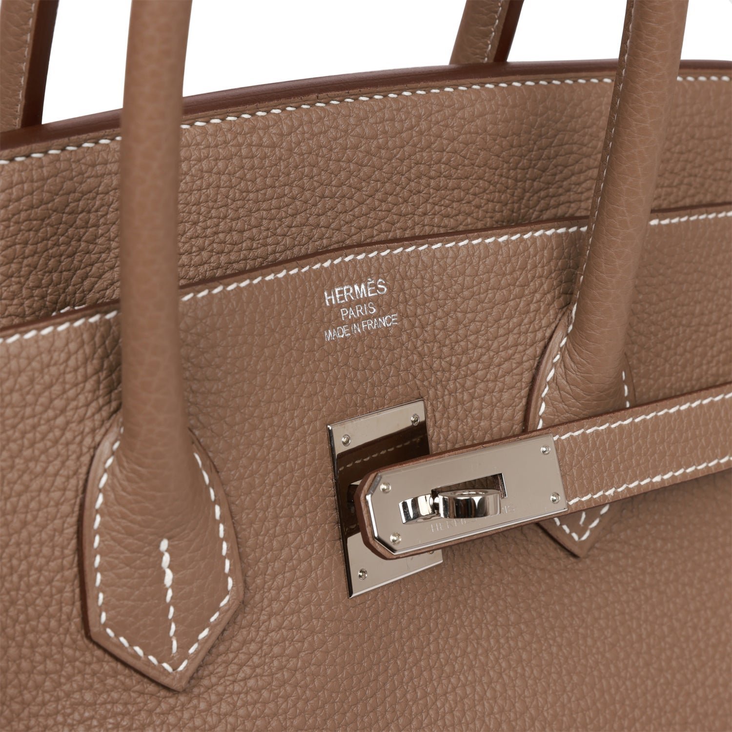 This Birkin is in Etoupe togo leather with palladium hardware and has contrast stitching, front flap, two straps with center toggle closure, clochette with lock and two keys, and double rolled handles.