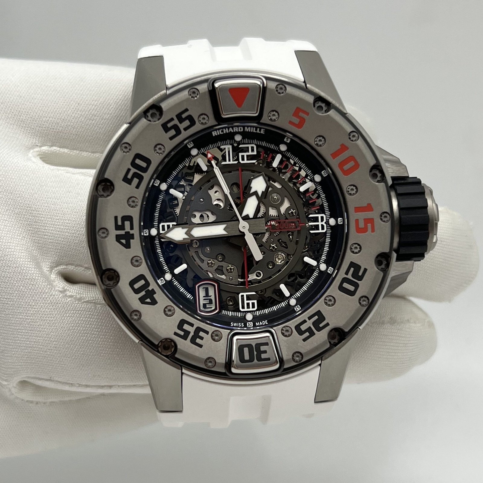 This Richard Mille RM 028 Diver is crafted in a 47mm titanium case surrounding a transparent dial. The watch comes on a white rubber bracelet.