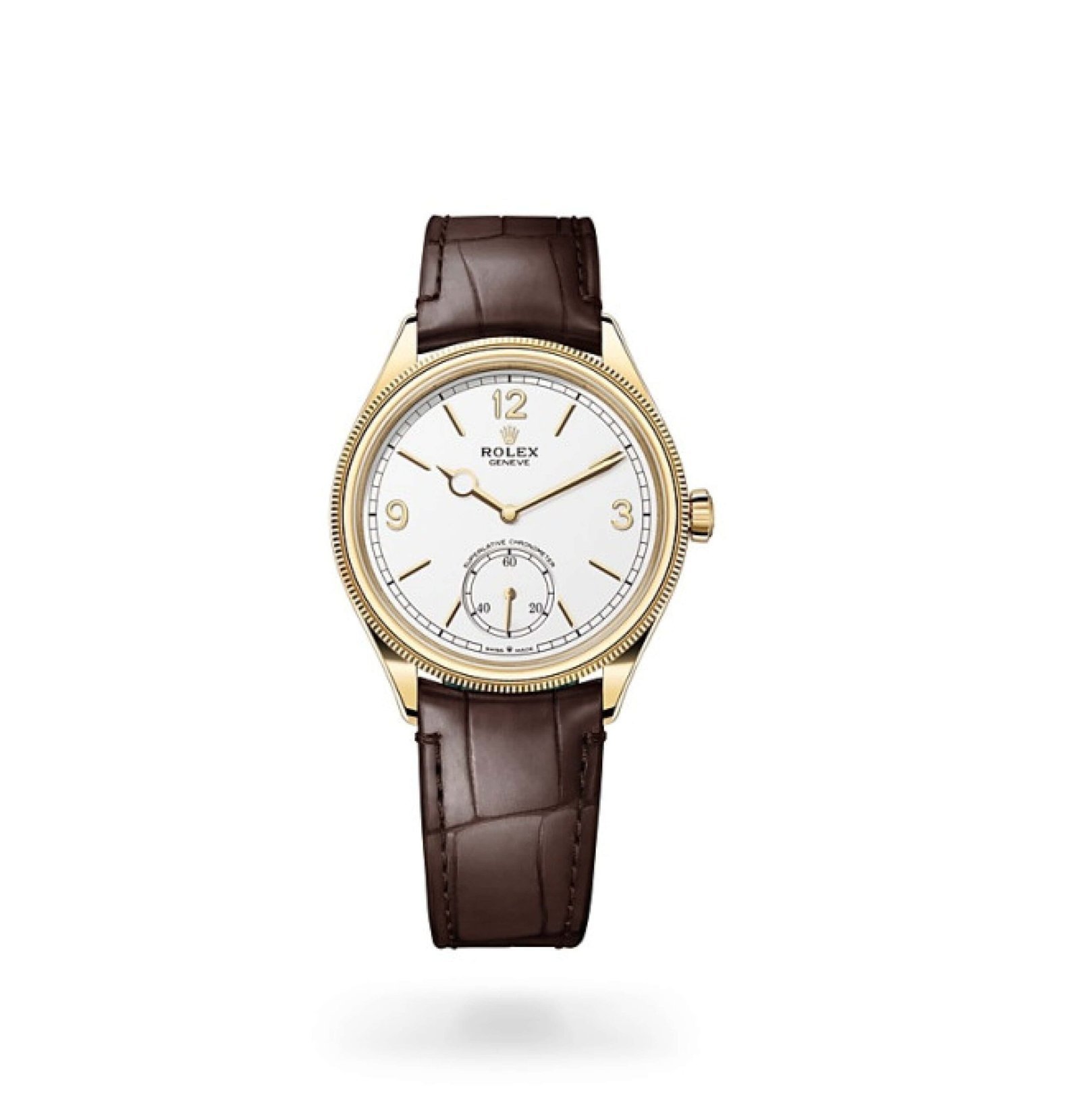 The Rolex Perpetual 1908 is designed with a 39mm yellow gold case, framed by an elegant, textured dome and fluted bezel. The white dial features a white dial with applied 18k yellow gold roman numerals and hands and hosts small seconds timekeeping at 6 o’clock. The open case back is protected by a scratch-resistant sapphire-crystal and protects the 7140 caliber while giving the wearer a glimpse of the movement in action. With the Rolex Cellini having retired, the Rolex Perpetual 1908 takes the stage as the classy dress watch for the next generation of watch lovers.