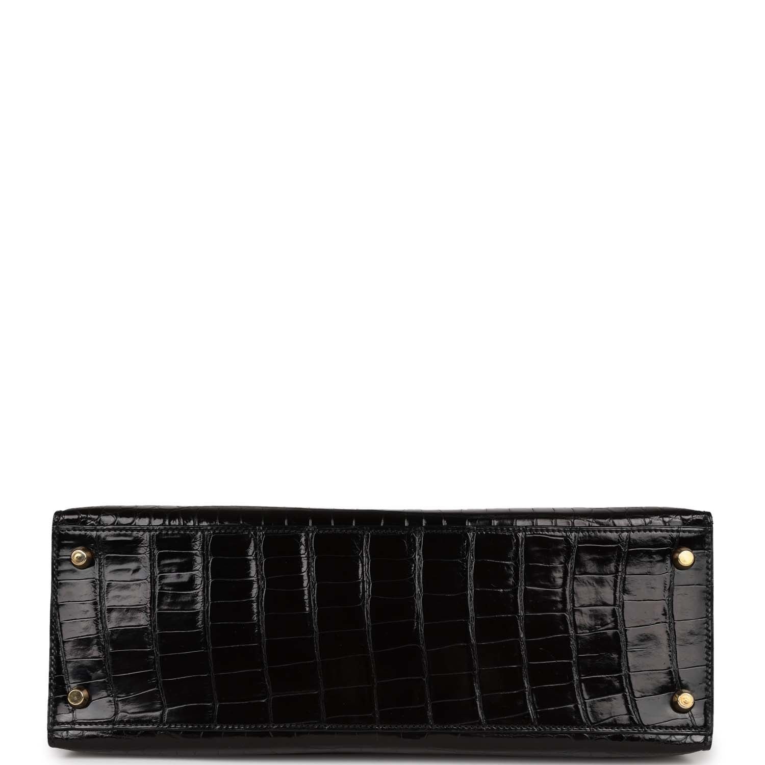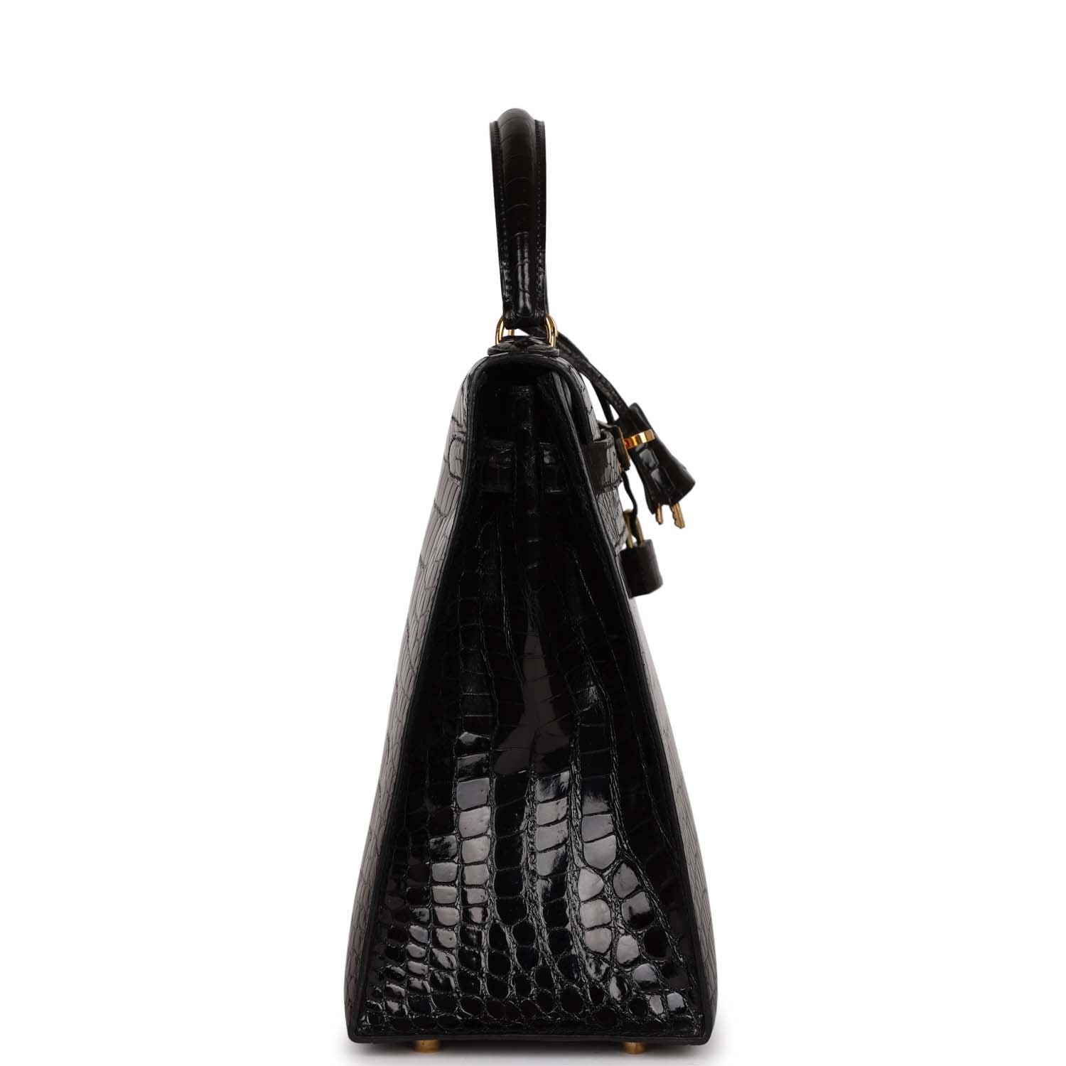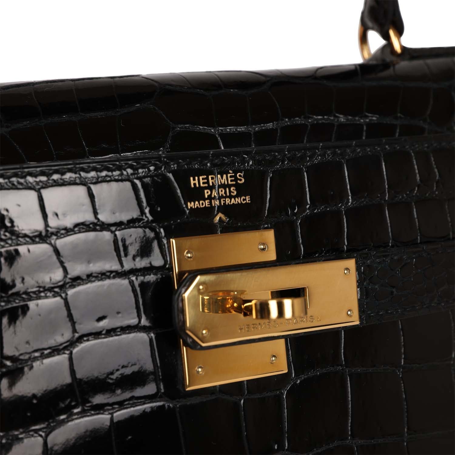 This Kelly is in Black shiny niloticus crocodile with gold hardware and features tonal stitching, a front toggle closure, a clochette with lock and two keys and a single rolled handle.